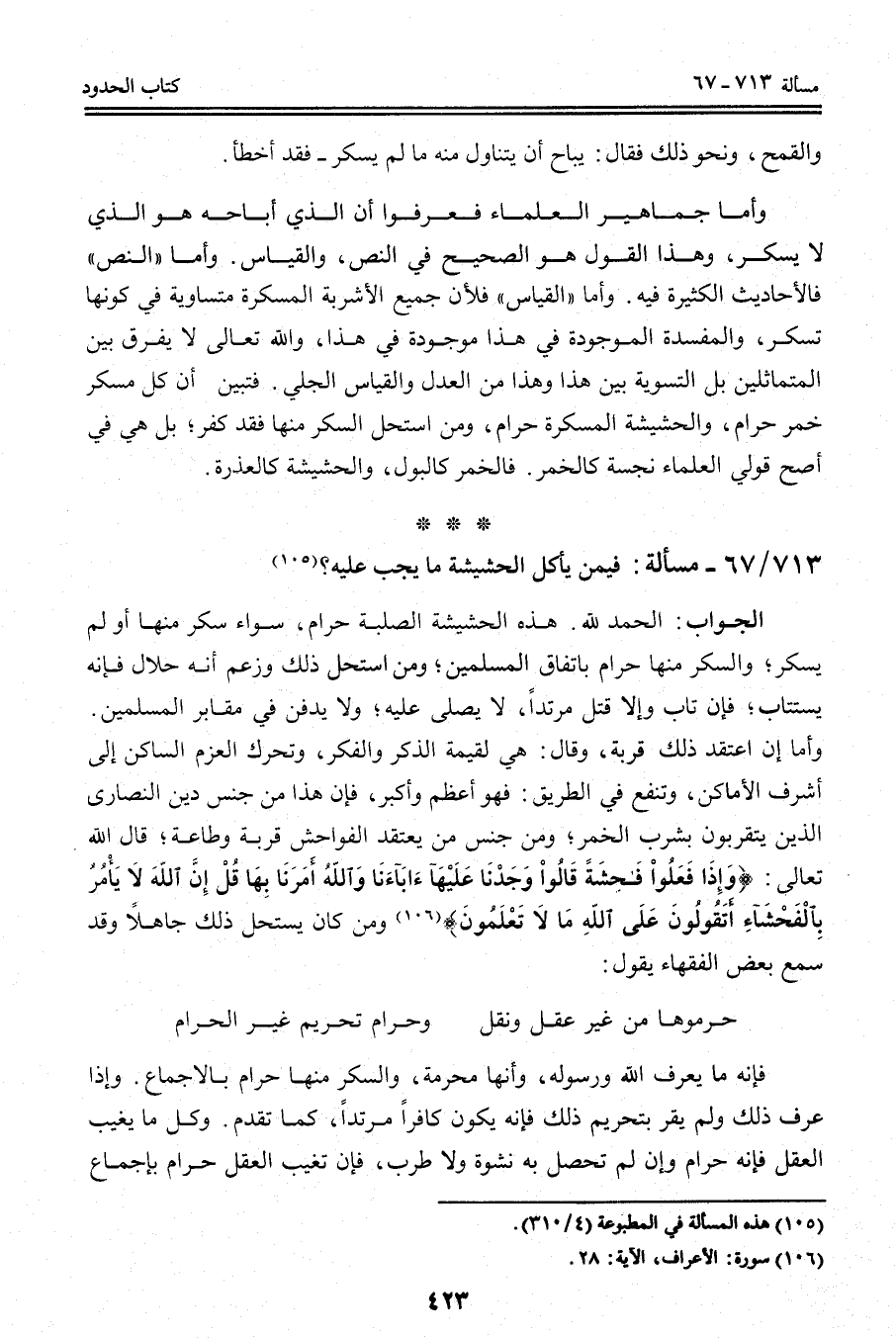 وَأَمَّا جَمَاهِيرُ الْعُلَمَاءِ فَعَرَفُوا أَنَّ الَّذِي أَبَاحَهُ هُوَ الَّذِي لَا يُسْكِرُ، وَهَذَا الْقَوْلُ هُوَ الصَّحِيحُ فِي النَّصِّ، وَالْقِيَاسِ. وَأَمَّا " النَّصُّ " فَالْأَحَادِيثُ الْكَثِيرَةُ فِيهِ. وَأَمَّا " الْقِيَاسُ " فَلِأَنَّ جَمِيعَ الْأَشْرِبَةِ الْمُسْكِرَةِ مُتَسَاوِيَةٌ فِي كَوْنِهَا تُسْكِرُ، وَالْمَفْسَدَةُ الْمَوْجُودَةُ فِي هَذَا مَوْجُودَةٌ فِي هَذَا، وَاَللَّهُ تَعَالَى لَا يُفَرِّقُ بَيْنَ الْمُتَمَاثِلَيْنِ بَلْ التَّسْوِيَةُ بَيْنَ هَذَا وَهَذَا مِنْ الْعَدْلِ وَالْقِيَاسِ الْجَلِيِّ. فَتَبَيَّنَ أَنَّ كُلَّ مُسْكِرٍ خَمْرٌ حَرَامٌ، وَالْحَشِيشَةُ الْمُسْكِرَةُ حَرَامٌ، وَمَنْ اسْتَحَلَّ السُّكْرَ مِنْهَا فَقَدْ كَفَرَ؛ بَلْ هِيَ فِي أَصَحِّ قَوْلَيْ الْعُلَمَاءِ نَجِسَةٌ كَالْخَمْرِ. فَالْخَمْرُ كَالْبَوْلِ، وَالْحَشِيشَةُ كَالْعَذِرَةِ.