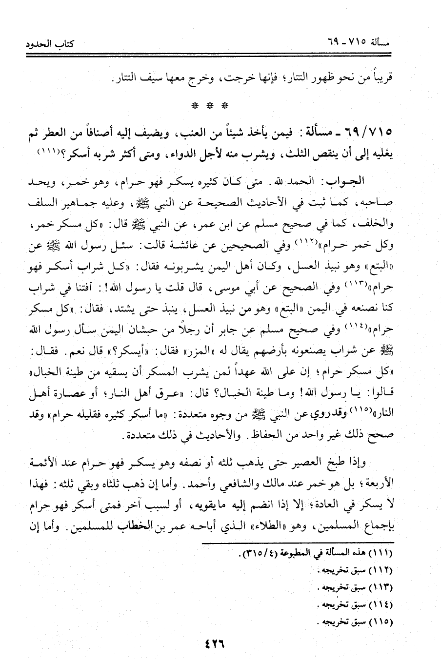 715 - 69 - مَسْأَلَةٌ. فِيمَنْ يَأْخُذُ شَيْئًا مِنْ الْعِنَبِ، وَيُضِيفُ إلَيْهِ أَصْنَافًا مِنْ الْعِطْرِ ثُمَّ يَغْلِيهِ إلَى أَنْ يَنْقُصَ الثُّلُثُ، وَيَشْرَبُ مِنْهُ لِأَجْلِ الدَّوَاءِ، وَمَتَى أَكْثَرَ شُرْبَهُ أَسْكَرَ؟
