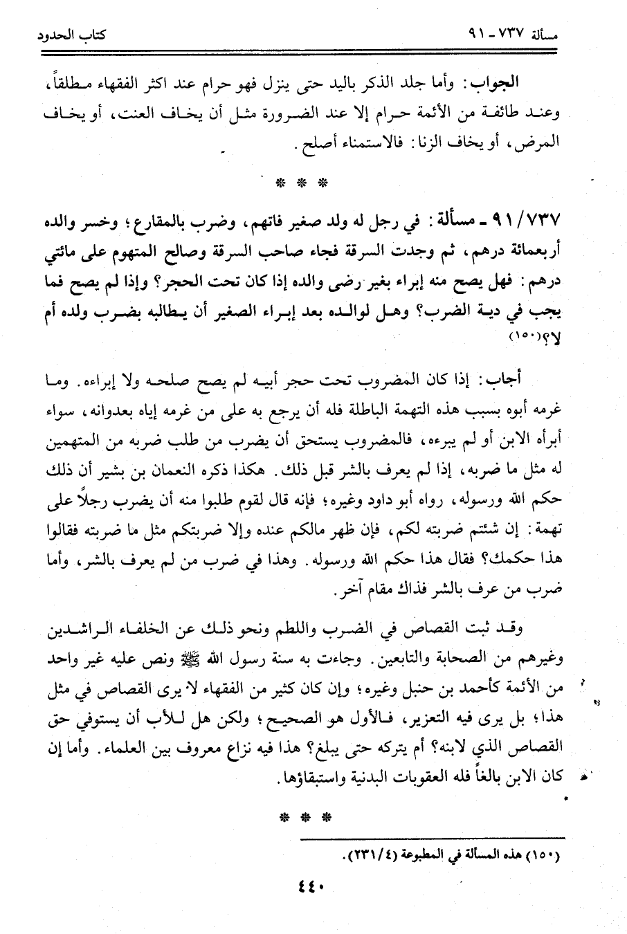 وَقَدْ ثَبَتَ الْقِصَاصُ فِي الضَّرْبِ وَاللَّطْمِ وَنَحْوِ ذَلِكَ عَنْ الْخُلَفَاءِ الرَّاشِدِينَ وَغَيْرِهِمْ مِنْ الصَّحَابَةِ وَالتَّابِعِينَ. وَجَاءَتْ بِهِ سُنَّةُ رَسُولِ اللَّهِ - صَلَّى اللَّهُ عَلَيْهِ وَسَلَّمَ - وَنَصَّ عَلَيْهِ غَيْرُ وَاحِدٍ مِنْ الْأَئِمَّةِ كَأَحْمَدَ بْنِ حَنْبَلٍ وَغَيْرِهِ؛ وَإِنْ كَانَ كَثِيرٌ مِنْ الْفُقَهَاءِ لَا يَرَى الْقِصَاصَ فِي مِثْلِ هَذَا؛ بَلْ يَرَى فِيهِ التَّعْزِيرَ، فَالْأَوَّلُ هُوَ الصَّحِيحُ؛ وَلَكِنْ هَلْ لِلْأَبِ أَنْ يَسْتَوْفِيَ حَقَّ الْقِصَاصِ الَّذِي لِابْنِهِ؟ أَمْ يَتْرُكُهُ حَتَّى يَبْلُغَ؟ هَذَا فِيهِ نِزَاعٌ مَعْرُوفٌ بَيْنَ الْعُلَمَاءِ. وَأَمَّا إنْ كَانَ الِابْنُ بَالِغًا فَلَهُ الْعُقُوبَاتُ الْبَدَنِيَّةُ وَاسْتِبْقَاؤُهَا.