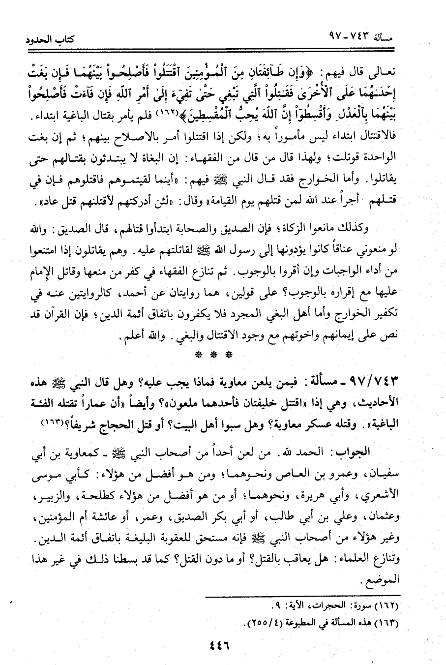 فِيمَنْ يَلْعَنُ مُعَاوِيَةَ فَمَاذَا يَجِبُ عَلَيْهِ؟ وَهَلْ قَالَ النَّبِيُّ - صَلَّى اللَّهُ عَلَيْهِ وَسَلَّمَ - هَذِهِ الْأَحَادِيثَ، وَهِيَ إذَا «اقْتَتَلَ خَلِيفَتَانِ فَأَحَدُهُمَا مَلْعُونٌ» ؟ وَأَيْضًا «أَنَّ عَمَّارًا تَقْتُلُهُ الْفِئَةُ الْبَاغِيَةُ» . وَقَتَلَهُ عَسْكَرُ مُعَاوِيَةَ؟ وَهَلْ سَبَوْا أَهْلَ الْبَيْتِ؟ أَوْ قَتَلَ الْحُجَّاجُ شَرِيفًا؟