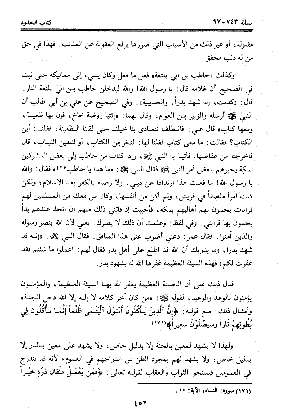 فَدَلَّ ذَلِكَ عَلَى أَنَّ الْحَسَنَةَ الْعَظِيمَةَ يَغْفِرُ اللَّهُ بِهَا السَّيِّئَةَ الْعَظِيمَةَ، وَالْمُؤْمِنُونَ يُؤْمِنُونَ بِالْوَعْدِ وَالْوَعِيدِ، لِقَوْلِهِ - صَلَّى اللَّهُ عَلَيْهِ وَسَلَّمَ -: «مَنْ كَانَ آخِرُ كَلَامِهِ لَا إلَهَ إلَّا اللَّهُ دَخَلَ الْجَنَّةَ» وَأَمْثَالُ ذَلِكَ: مَعَ قَوْلِهِ: {إِنَّ الَّذِينَ يَأْكُلُونَ أَمْوَالَ الْيَتَامَى ظُلْمًا إِنَّمَا يَأْكُلُونَ فِي بُطُونِهِمْ نَارًا وَسَيَصْلَوْنَ سَعِيرًا} [النساء: 10] وَلِهَذَا لَا يُشْهَدُ لِمُعَيَّنٍ بِالْجَنَّةِ إلَّا بِدَلِيلٍ خَاصٍّ، وَلَا يُشْهَدُ عَلَى مُعَيَّنٍ بِالنَّارِ إلَّا بِدَلِيلٍ خَاصٍّ؛ وَلَا يُشْهَدُ لَهُمْ بِمُجَرَّدِ الظَّنِّ مِنْ انْدِرَاجِهِمْ فِي الْعُمُومِ؛ لِأَنَّهُ قَدْ يَنْدَرِجُ فِي الْعُمُومَيْنِ فَيَسْتَحِقُّ الثَّوَابَ وَالْعِقَابَ لِقَوْلِهِ تَعَالَى: {فَمَنْ يَعْمَلْ مِثْقَالَ ذَرَّةٍ خَيْرًا يَرَهُ} [الزلزلة: 7] {وَمَنْ يَعْمَلْ مِثْقَالَ ذَرَّةٍ شَرًّا يَرَهُ} [الزلزلة: 8]