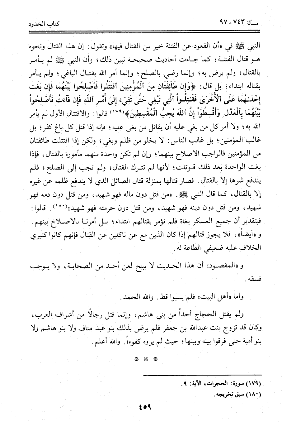 النَّبِيِّ - صَلَّى اللَّهُ عَلَيْهِ وَسَلَّمَ - فِي «أَنَّ الْقُعُودَ عَنْ الْفِتْنَةِ خَيْرٌ مِنْ الْقِتَالِ فِيهَا» وَتَقُولُ: إنَّ هَذَا الْقِتَالَ وَنَحْوَهُ هُوَ قِتَالُ الْفِتْنَةِ؛ كَمَا جَاءَتْ أَحَادِيثُ صَحِيحَةٌ تُبَيِّنُ ذَلِكَ؛ وَأَنَّ النَّبِيَّ - صَلَّى اللَّهُ عَلَيْهِ وَسَلَّمَ - لَمْ يَأْمُرْ بِالْقِتَالِ؛ وَلَمْ يَرْضَ لَهُ؛ وَإِنَّمَا رَضِيَ بِالصُّلْحِ؛ وَإِنَّمَا أَمَرَ اللَّهُ بِقِتَالِ الْبَاغِي؛ وَلَمْ يَأْمُرْ بِقِتَالِهِ ابْتِدَاءً؛ بَلْ قَالَ: {وَإِنْ طَائِفَتَانِ مِنَ الْمُؤْمِنِينَ اقْتَتَلُوا فَأَصْلِحُوا بَيْنَهُمَا فَإِنْ بَغَتْ إِحْدَاهُمَا عَلَى الأُخْرَى فَقَاتِلُوا الَّتِي تَبْغِي حَتَّى تَفِيءَ إِلَى أَمْرِ اللَّهِ فَإِنْ فَاءَتْ فَأَصْلِحُوا بَيْنَهُمَا بِالْعَدْلِ وَأَقْسِطُوا إِنَّ اللَّهَ يُحِبُّ الْمُقْسِطِينَ} [الحجرات: 9] قَالُوا: وَالِاقْتِتَالُ الْأَوَّلُ لَمْ يَأْمُرْ اللَّهُ بِهِ؛ وَلَا أَمَرَ كُلَّ مَنْ بُغِيَ عَلَيْهِ أَنْ يُقَاتِلَ مَنْ بَغَى عَلَيْهِ؛ فَإِنَّهُ إذَا قَتَلَ كُلَّ بَاغٍ كَفَرَ؛ بَلْ غَالِبُ الْمُؤْمِنِينَ؛ بَلْ غَالِبُ النَّاسِ: لَا يَخْلُو مِنْ ظُلْمٍ وَبَغْيٍ؛ وَلَكِنْ إذَا اقْتَتَلَتْ طَائِفَتَانِ مِنْ الْمُؤْمِنِينَ فَالْوَاجِبُ الْإِصْلَاحُ بَيْنَهُمَا؛ وَإِنْ لَمْ تَكُنْ وَاحِدَةٌ مِنْهُمَا مَأْمُورَةً بِالْقِتَالِ، فَإِذَا بَغَتْ الْوَاحِدَةُ بَعْدَ ذَلِكَ قُوتِلَتْ؛ لِأَنَّهَا لَمْ تَتْرُكْ الْقِتَالَ؛ وَلَمْ تُجِبْ إلَى الصُّلْحِ؛ فَلَمْ يَنْدَفِعْ شَرُّهَا إلَّا بِالْقِتَالِ فَصَارَ قِتَالُهَا بِمَنْزِلَةِ قِتَالِ الصَّائِلِ الَّذِي لَا يَنْدَفِعُ ظُلْمُهُ عَنْ غَيْرِهِ إلَّا بِالْقِتَالِ، كَمَا قَالَ النَّبِيُّ - صَلَّى اللَّهُ عَلَيْهِ وَسَلَّمَ -. «مَنْ قُتِلَ دُونَ مَالِهِ فَهُوَ شَهِيدٌ، وَمَنْ قُتِلَ دُونَ دَمِهِ فَهُوَ شَهِيدٌ، وَمَنْ قُتِلَ دُونَ دِينِهِ فَهُوَ شَهِيدٌ، وَمَنْ قُتِلَ دُونَ حُرْمَتِهِ فَهُوَ شَهِيدٌ» . قَالُوا: فَبِتَقْدِيرِ أَنَّ جَمِيعَ الْعَسْكَرِ بُغَاةٌ فَلَمْ نُؤْمَرْ بِقِتَالِهِمْ ابْتِدَاءً؛ بَلْ أُمِرْنَا بِالْإِصْلَاحِ بَيْنَهُمْ.