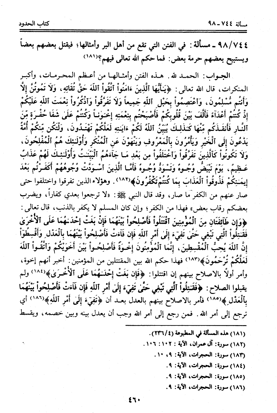 الْجَوَابُ: الْحَمْدُ لِلَّهِ. هَذِهِ الْفِتَنُ وَأَمْثَالُهَا مِنْ أَعْظَمِ الْمُحَرَّمَاتِ، وَأَكْبَرِ الْمُنْكَرَاتِ، قَالَ اللَّهُ تَعَالَى: {يَا أَيُّهَا الَّذِينَ آمَنُوا اتَّقُوا اللَّهَ حَقَّ تُقَاتِهِ وَلا تَمُوتُنَّ إِلا وَأَنْتُمْ مُسْلِمُونَ} [آل عمران: 102] {وَاعْتَصِمُوا بِحَبْلِ اللَّهِ جَمِيعًا وَلا تَفَرَّقُوا وَاذْكُرُوا نِعْمَتَ اللَّهِ عَلَيْكُمْ إِذْ كُنْتُمْ أَعْدَاءً فَأَلَّفَ بَيْنَ قُلُوبِكُمْ فَأَصْبَحْتُمْ بِنِعْمَتِهِ إِخْوَانًا وَكُنْتُمْ عَلَى شَفَا حُفْرَةٍ مِنَ النَّارِ فَأَنْقَذَكُمْ مِنْهَا كَذَلِكَ يُبَيِّنُ اللَّهُ لَكُمْ آيَاتِهِ لَعَلَّكُمْ تَهْتَدُونَ} [آل عمران: 103] {وَلْتَكُنْ مِنْكُمْ أُمَّةٌ يَدْعُونَ إِلَى الْخَيْرِ وَيَأْمُرُونَ بِالْمَعْرُوفِ وَيَنْهَوْنَ عَنِ الْمُنْكَرِ وَأُولَئِكَ هُمُ الْمُفْلِحُونَ} [آل عمران: 104] {وَلا تَكُونُوا كَالَّذِينَ تَفَرَّقُوا وَاخْتَلَفُوا مِنْ بَعْدِ مَا جَاءَهُمُ الْبَيِّنَاتُ وَأُولَئِكَ لَهُمْ عَذَابٌ عَظِيمٌ} [آل عمران: 105] {يَوْمَ تَبْيَضُّ وُجُوهٌ وَتَسْوَدُّ وُجُوهٌ فَأَمَّا الَّذِينَ اسْوَدَّتْ وُجُوهُهُمْ أَكَفَرْتُمْ بَعْدَ إِيمَانِكُمْ فَذُوقُوا الْعَذَابَ بِمَا كُنْتُمْ تَكْفُرُونَ} [آل عمران: 106] .