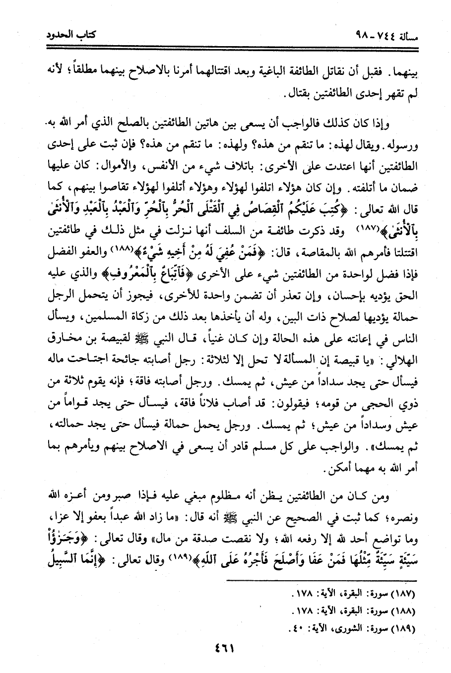 وَإِذَا كَانَ كَذَلِكَ فَالْوَاجِبُ أَنْ يُسْعَى بَيْنَ هَاتَيْنِ الطَّائِفَتَيْنِ بِالصُّلْحِ الَّذِي أَمَرَ اللَّهُ بِهِ. وَرَسُولُهُ. وَيُقَالُ لِهَذِهِ: مَا تَنْقِمُ مِنْ هَذِهِ؟ وَلِهَذِهِ: مَا تَنْقِمُ مِنْ هَذِهِ؟ فَإِنْ ثَبَتَ عَلَى إحْدَى الطَّائِفَتَيْنِ أَنَّهَا اعْتَدَتْ عَلَى الْأُخْرَى: بِإِتْلَافِ شَيْءٍ مِنْ الْأَنْفُسِ، وَالْأَمْوَالِ: كَانَ عَلَيْهَا ضَمَانُ مَا أَتْلَفَتْهُ. وَإِنْ كَانَ هَؤُلَاءِ أَتْلَفُوا لِهَؤُلَاءِ وَهَؤُلَاءِ أَتْلَفُوا لِهَؤُلَاءِ تَقَاصُّوا بَيْنَهُمْ، كَمَا قَالَ اللَّهُ تَعَالَى: {كُتِبَ عَلَيْكُمُ الْقِصَاصُ فِي الْقَتْلَى الْحُرُّ بِالْحُرِّ وَالْعَبْدُ بِالْعَبْدِ وَالأُنْثَى بِالأُنْثَى} [البقرة: 178] وَقَدْ ذَكَرَتْ طَائِفَةٌ مِنْ السَّلَفِ أَنَّهَا نَزَلَتْ فِي مِثْلِ ذَلِكَ فِي طَائِفَتَيْنِ اقْتَتَلَتَا فَأَمَرَهُمْ اللَّهُ بِالْمُقَاصَّةِ، قَالَ: {فَمَنْ عُفِيَ لَهُ مِنْ أَخِيهِ شَيْءٌ} [البقرة: 178] وَالْعَفْوُ الْفَضْلُ فَإِذَا فَضَلَ لِوَاحِدَةٍ مِنْ الطَّائِفَتَيْنِ شَيْءٌ عَلَى الْأُخْرَى {فَاتِّبَاعٌ بِالْمَعْرُوفِ} [البقرة: 178] وَاَلَّذِي عَلَيْهِ الْحَقُّ يُؤَدِّيهِ بِإِحْسَانٍ، وَإِنْ تَعَذَّرَ أَنْ تَضْمَنَ وَاحِدَةٌ لِلْأُخْرَى، فَيَجُوزُ أَنْ يَتَحَمَّلَ الرَّجُلُ حَمَالَةً يُؤَدِّيهَا لِصَلَاحِ ذَاتِ الْبَيْنِ، وَلَهُ أَنْ يَأْخُذَهَا بَعْدَ ذَلِكَ مِنْ زَكَاةِ الْمُسْلِمِينَ، وَيَسْأَلَ النَّاسَ فِي إعَانَتِهِ عَلَى هَذِهِ الْحَالَةِ وَإِنْ كَانَ غَنِيًّا، «قَالَ النَّبِيُّ - صَلَّى اللَّهُ عَلَيْهِ وَسَلَّمَ - لِقَبِيصَةَ بْنِ مُخَارِقٍ الْهِلَالِيِّ: يَا قَبِيصَةُ إنَّ الْمَسْأَلَةَ لَا تَحِلُّ إلَّا لِثَلَاثَةٍ: رَجُلٌ أَصَابَتْهُ جَائِحَةٌ اجْتَاحَتْ مَالَهُ فَيَسْأَلُ حَتَّى يَجِدَ سَدَادًا مِنْ عَيْشٍ، ثُمَّ يُمْسِكُ. وَرَجُلٌ أَصَابَتْهُ فَاقَةٌ؛ فَإِنَّهُ يَقُومُ ثَلَاثَةً مِنْ ذَوِي الْحِجَا مِنْ قَوْمِهِ؛ فَيَقُولُونَ: قَدْ أَصَابَ فُلَانًا فَاقَةٌ، فَيَسْأَلُ حَتَّى يَجِدَ قِوَامًا مِنْ عَيْشٍ وَسَدَادًا مِنْ عَيْشٍ؛ ثُمَّ يُمْسِكُ. وَرَجُلٌ يَحْمِلُ حَمَالَةً فَيَسْأَلُ حَتَّى يَجِدَ حَمَالَتَهُ، ثُمَّ يُمْسِكُ» . وَالْوَاجِبُ عَلَى كُلِّ مُسْلِمٍ قَادِرٍ أَنْ يَسْعَى فِي الْإِصْلَاحِ بَيْنَهُمْ وَيَأْمُرَهُمْ بِمَا أَمَرَ اللَّهُ بِهِ مَهْمَا أَمْكَنَ.