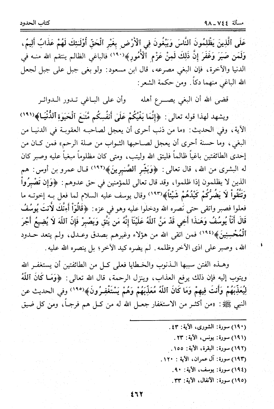 {إِنَّمَا السَّبِيلُ عَلَى الَّذِينَ يَظْلِمُونَ النَّاسَ وَيَبْغُونَ فِي الأَرْضِ بِغَيْرِ الْحَقِّ أُولَئِكَ لَهُمْ عَذَابٌ أَلِيمٌ} [الشورى: 42] {وَلَمَنْ صَبَرَ وَغَفَرَ إِنَّ ذَلِكَ لَمِنْ عَزْمِ الأُمُورِ} [الشورى: 43] فَالْبَاغِي الظَّالِمُ يَنْتَقِمُ اللَّهُ مِنْهُ فِي الدُّنْيَا وَالْآخِرَةِ، فَإِنَّ الْبَغْيَ مَصْرَعُهُ، قَالَ ابْنُ مَسْعُودٍ: وَلَوْ بَغَى جَبَلٌ عَلَى جَبَلٍ لَجَعَلَ اللَّهُ الْبَاغِيَ مِنْهُمَا دَكًّا. وَمِنْ حِكْمَةِ الشِّعْرِ: