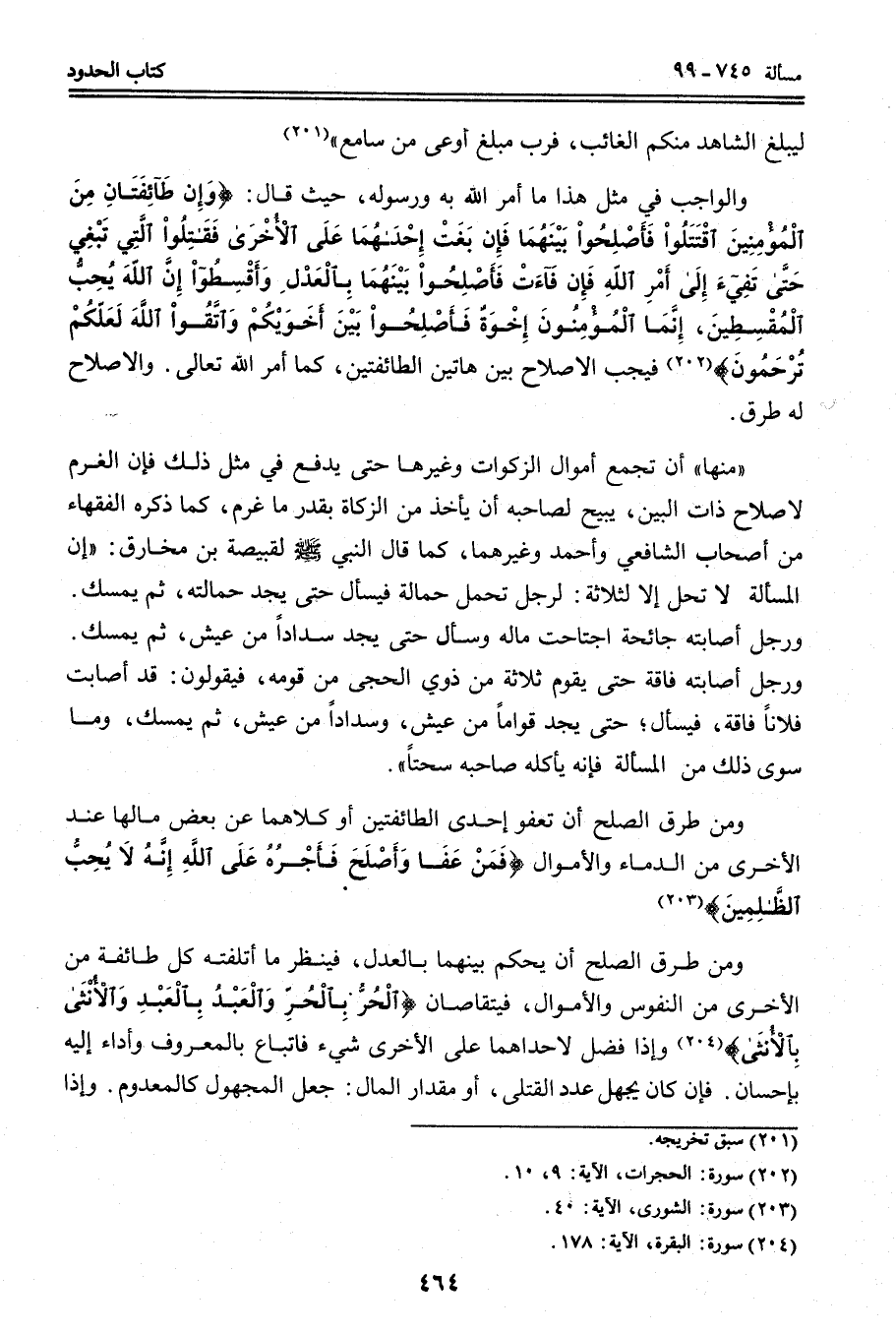 لِيُبَلِّغْ الشَّاهِدُ مِنْكُمْ الْغَائِبَ، فَرُبَّ مُبَلَّغٍ أَوْعَى مِنْ سَامِعٍ» وَالْوَاجِبُ فِي مِثْلِ هَذَا مَا أَمَرَ اللَّهُ بِهِ وَرَسُولُهُ، حَيْثُ قَالَ: {وَإِنْ طَائِفَتَانِ مِنَ الْمُؤْمِنِينَ اقْتَتَلُوا فَأَصْلِحُوا بَيْنَهُمَا فَإِنْ بَغَتْ إِحْدَاهُمَا عَلَى الأُخْرَى فَقَاتِلُوا الَّتِي تَبْغِي حَتَّى تَفِيءَ إِلَى أَمْرِ اللَّهِ فَإِنْ فَاءَتْ فَأَصْلِحُوا بَيْنَهُمَا بِالْعَدْلِ وَأَقْسِطُوا إِنَّ اللَّهَ يُحِبُّ الْمُقْسِطِينَ} [الحجرات: 9] {إِنَّمَا الْمُؤْمِنُونَ إِخْوَةٌ فَأَصْلِحُوا بَيْنَ أَخَوَيْكُمْ وَاتَّقُوا اللَّهَ لَعَلَّكُمْ تُرْحَمُونَ} [الحجرات: 10] فَيَجِبُ الْإِصْلَاحُ بَيْنَ هَاتَيْنِ الطَّائِفَتَيْنِ، كَمَا أَمَرَ اللَّهُ تَعَالَى. وَالْإِصْلَاحُ لَهُ طُرُقٌ.
