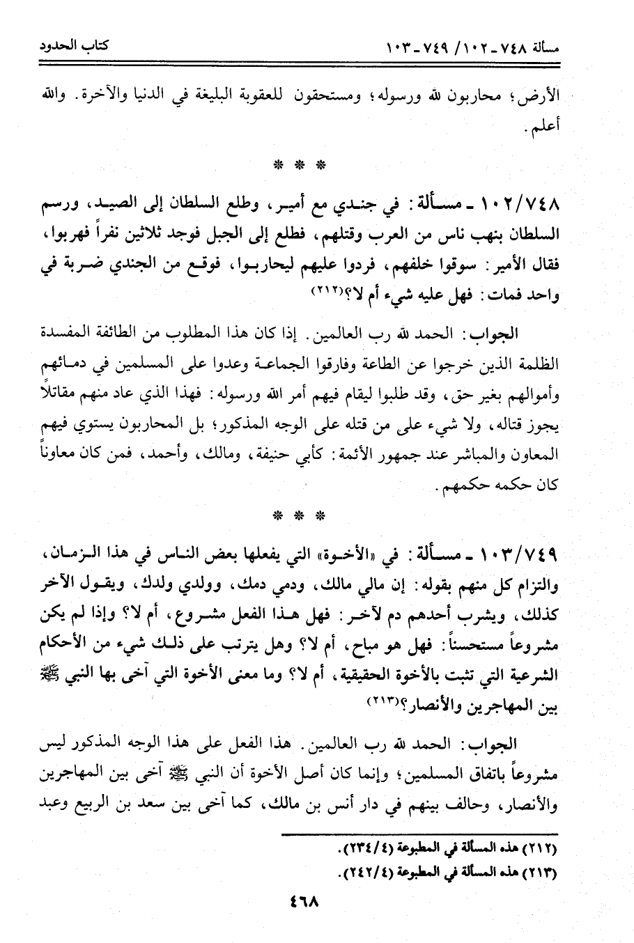 748 - 102 - مَسْأَلَةٌ: فِي جُنْدِيٍّ مَعَ أَمِيرٍ، وَطَلَعَ السُّلْطَانُ إلَى الصَّيْدِ، وَرَسَمَ السُّلْطَانُ بِنَهْبِ نَاسٍ مِنْ الْعَرَبِ وَقَتْلِهِمْ، فَطَلَعَ إلَى الْجَبَلِ فَوَجَدَ ثَلَاثِينَ نَفَرًا فَهَرَبُوا، فَقَالَ الْأَمِيرُ: سُوقُوا خَلْفَهُمْ، فَرَدُّوا عَلَيْهِمْ لِيُحَارِبُوا، فَوَقَعَ مِنْ الْجُنْدِيِّ ضَرْبَةٌ فِي وَاحِدٍ فَمَاتَ: فَهَلْ عَلَيْهِ شَيْءٌ أَمْ لَا؟