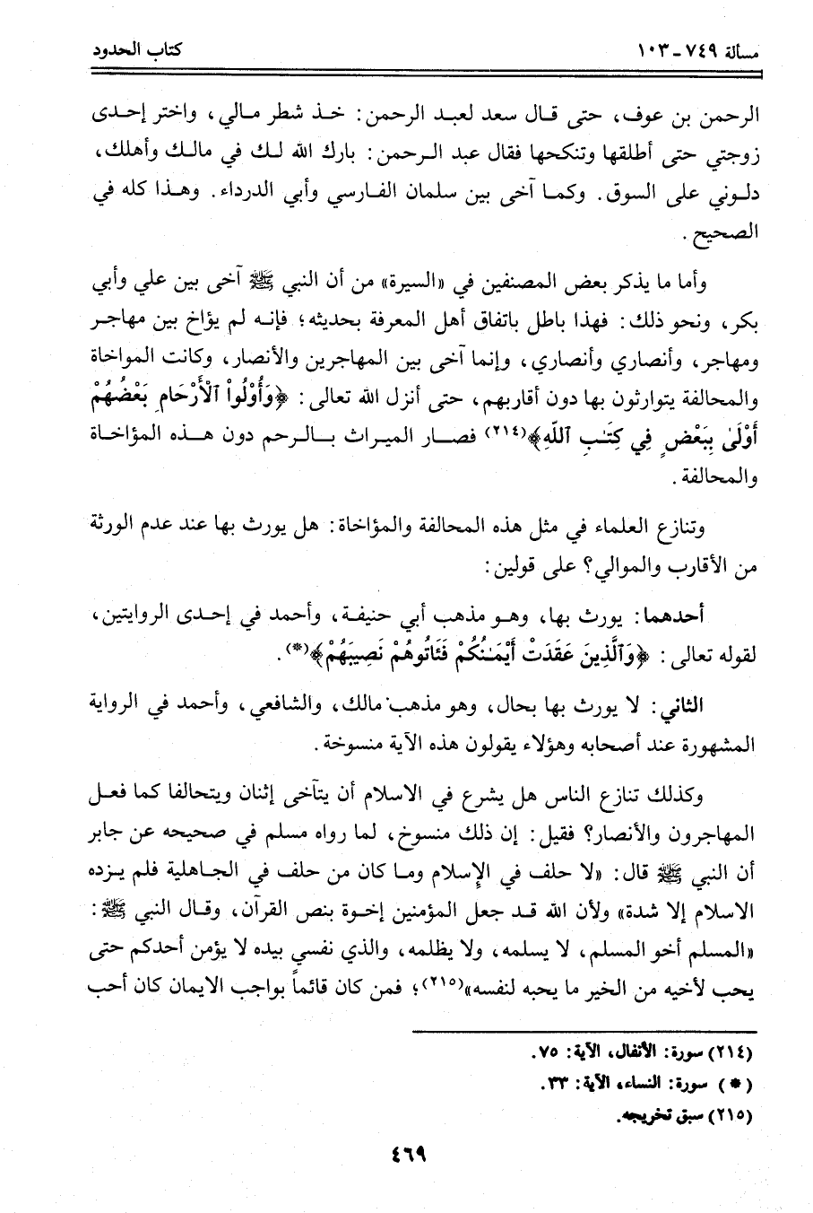 وَتَنَازَعَ الْعُلَمَاءُ فِي مِثْلِ هَذِهِ الْمُحَالَفَةِ وَالْمُؤَاخَاةِ: هَلْ يُورَثُ بِهَا عِنْدَ عَدَمِ الْوَرَثَةِ مِنْ الْأَقَارِبِ وَالْمَوَالِي؟ عَلَى قَوْلَيْنِ: أَحَدُهُمَا: يُورَثُ بِهَا، وَهُوَ مَذْهَبُ أَبِي حَنِيفَةَ، وَأَحْمَدَ فِي إحْدَى الرِّوَايَتَيْنِ، لِقَوْلِهِ تَعَالَى: {وَالَّذِينَ عَقَدَتْ أَيْمَانُكُمْ فَآتُوهُمْ نَصِيبَهُمْ} [النساء: 33] () .