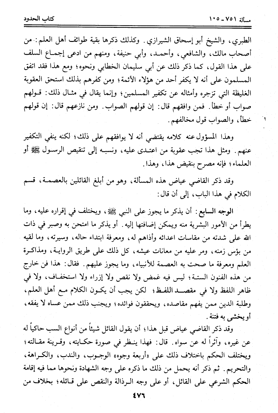 وَقَدْ ذَكَرَ الْقَاضِي عِيَاضٌ هَذِهِ الْمَسْأَلَةَ، وَهُوَ مِنْ أَبْلَغِ الْقَائِلِينَ بِالْعِصْمَةِ، قَسَّمَ الْكَلَامَ فِي هَذَا الْبَابِ، إلَى أَنْ قَالَ: الْوَجْهُ السَّابِعُ: أَنْ يَذْكُرَ مَا يَجُوزُ عَلَى النَّبِيِّ - صَلَّى اللَّهُ عَلَيْهِ وَسَلَّمَ - وَيَخْتَلِفُ فِي إقْرَارِهِ عَلَيْهِ، وَمَا يَطْرَأُ مِنْ الْأُمُورِ الْبَشَرِيَّةِ مِنْهُ وَيُمْكِنُ إضَافَتُهَا إلَيْهِ. أَوْ يَذْكُرُ مَا اُمْتُحِنَ بِهِ وَصَبَرَ فِي ذَاتِ اللَّهِ عَلَى شِدَّتِهِ مِنْ مَقَاسَاتِ أَعْدَائِهِ وَأَذَاهُمْ لَهُ، وَمَعْرِفَةِ ابْتِدَاءِ حَالِهِ، وَسِيرَتِهِ، وَمَا لَقِيَهُ مِنْ بُؤْسِ زَمَنِهِ، وَمَرَّ عَلَيْهِ مِنْ مُعَانَاتِ عَيْشِهِ، كُلُّ ذَلِكَ عَلَى طَرِيقِ الرِّوَايَةِ، وَمُذَاكَرَةِ الْعِلْمِ وَمَعْرِفَةِ مَا صَحَّتْ بِهِ الْعِصْمَةُ لِلْأَنْبِيَاءِ، وَمَا يَجُوزُ عَلَيْهِمْ. فَقَالَ: هَذَا فَنٌّ خَارِجٌ مِنْ هَذِهِ الْفُنُونِ السِّتَّةِ؛ لَيْسَ فِيهِ غَمْضٌ وَلَا نَقْصٌ وَلَا إزْرَاءٌ وَلَا اسْتِخْفَافٌ، وَلَا فِي ظَاهِرِ اللَّفْظِ وَلَا فِي مَقْصِدِ اللَّفْظِ؛ لَكِنْ يَجِبُ أَنْ يَكُونَ الْكَلَامُ مَعَ أَهْلِ الْعِلْمِ، وَطَلَبَةِ الدِّينِ مِمَّنْ يَفْهَمُ مَقَاصِدَهُ، وَيُحَقِّقُونَ فَوَائِدَهُ؛ وَيُجَنِّبُ ذَلِكَ مِمَّنْ عَسَاهُ لَا يَفْقَهُ، أَوْ يَخْشَى بِهِ فِتْنَةً.