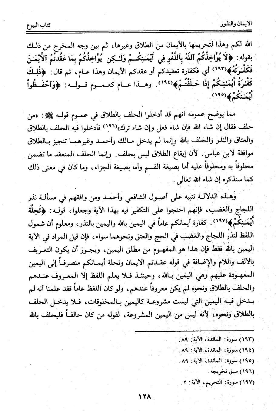 وَهَذِهِ الْأَدِلَّةُ تَنْبِيهٌ عَلَى أُصُولِ الشَّافِعِيِّ وَأَحْمَدَ وَمَنْ وَافَقَهُمْ فِي مَسْأَلَةِ نَذَرَ اللَّجَاجِ وَالْغَضَبِ، فَإِنَّهُمْ احْتَجُّوا عَلَى التَّكْفِيرِ فِيهِ بِهَذَا الْآيَةِ وَجَعَلُوا، قَوْلَهُ: {تَحِلَّةَ أَيْمَانِكُمْ} [التحريم: 2] . كَفَّارَةَ أَيْمَانِكُمْ عَامًّا فِي الْيَمِينِ بِاَللَّهِ وَالْيَمِينِ بِالنَّذْرِ، وَمَعْلُومٌ أَنَّ شُمُولَ اللَّفْظِ لِنَذْرِ اللَّجَاجِ وَالْغَضَبِ فِي الْحَجِّ وَالْعِتْقِ وَنَحْوِهِمَا سَوَاءٌ، فَإِنْ قِيلَ الْمُرَادُ فِي الْآيَةِ الْيَمِينُ بِاَللَّهِ فَقَطْ فَإِنَّ هَذَا هُوَ الْمَفْهُومُ مِنْ مُطْلَقِ الْيَمِينِ، وَيَجُوزُ أَنْ يَكُونَ التَّعْرِيفُ بِالْأَلِفِ وَاللَّامِ وَالْإِضَافَةِ فِي قَوْلِهِ {عَقَّدْتُمُ الأَيْمَانَ} [المائدة: 89] وَ {تَحِلَّةَ أَيْمَانِكُمْ} [التحريم: 2] مُنْصَرِفًا إلَى الْيَمِينِ الْمَعْهُودَةِ عَلَيْهِمْ وَهِيَ الْيَمِينُ بِاَللَّهِ، وَحِينَئِذٍ فَلَا يُعْلَمُ اللَّفْظُ إلَّا الْمَعْرُوفُ عِنْدَهُمْ وَالْحَلِفُ بِالطَّلَاقِ وَنَحْوِهِ لَمْ يَكُنْ مَعْرُوفًا عِنْدَهُمْ، وَلَوْ كَانَ اللَّفْظُ عَامًّا فَقَدْ عَلِمْنَا أَنَّهُ لَمْ يَدْخُلْ فِيهِ الْيَمِينُ الَّتِي لَيْسَتْ مَشْرُوعَةً كَالْيَمِينِ بِالْمَخْلُوقَاتِ، فَلَا يَدْخُلُ الْحَلِفُ بِالطَّلَاقِ وَنَحْوِهِ؛ لِأَنَّهُ لَيْسَ مِنْ الْيَمِينِ الْمَشْرُوعَةِ، لِقَوْلِهِ «مَنْ كَانَ حَالِفًا فَلْيَحْلِفْ بِاَللَّهِ