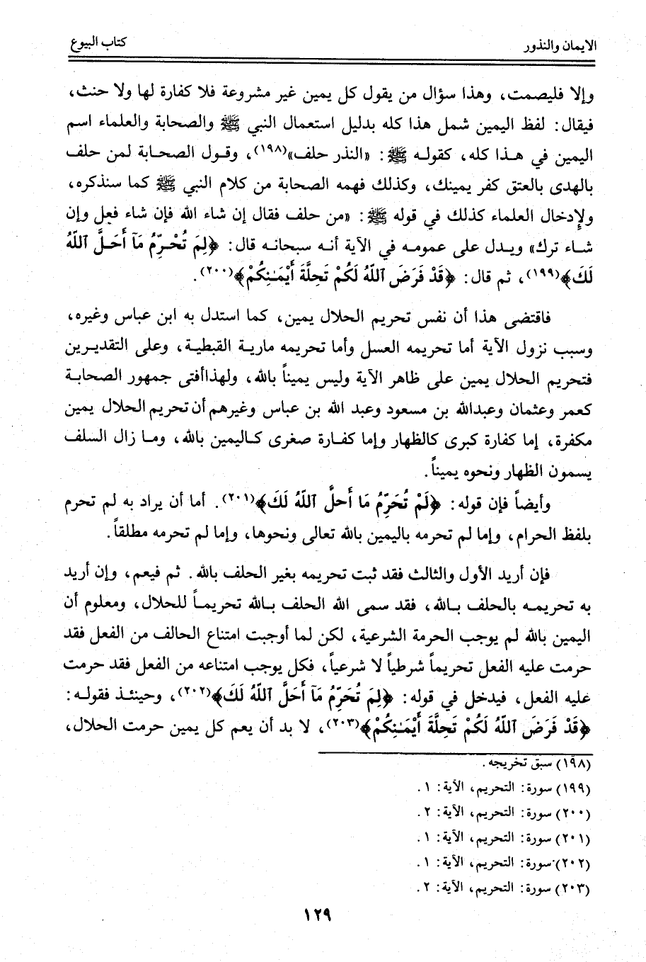 فَاقْتَضَى هَذَا أَنَّ نَفْسَ تَحْرِيمِ الْحَلَالِ يَمِينٌ، كَمَا اسْتَدَلَّ بِهِ ابْنُ عَبَّاسٍ وَغَيْرُهُ، وَسَبَبُ نُزُولِ الْآيَةِ إمَّا تَحْرِيمُهُ الْعَسَلَ وَإِمَّا تَحْرِيمُهُ مَارِيَةَ الْقِبْطِيَّةَ، وَعَلَى التَّقْدِيرَيْنِ فَتَحْرِيمُ الْحَلَالِ يَمِينٌ عَلَى ظَاهِرِ الْآيَةِ وَلَيْسَ يَمِينًا بِاَللَّهِ، وَلِهَذَا أَفْتَى جُمْهُورُ الصَّحَابَةِ كَعُمَرَ وَعُثْمَانَ وَعَبْدِ اللَّهِ بْنِ مَسْعُودٍ وَعَبْدِ اللَّهِ بْنِ عَبَّاسٍ وَغَيْرِهِمْ أَنَّ تَحْرِيمَ الْحَلَالِ يَمِينٌ مُكَفِّرَةٌ إمَّا كَفَّارَةٌ كُبْرَى كَالظِّهَارِ وَإِمَّا كَفَّارَةٌ صُغْرَى كَالْيَمِينِ بِاَللَّهِ، وَمَا زَالَ السَّلَفُ يُسَمُّونَ الظِّهَارَ وَنَحْوَهُ يَمِينًا.
