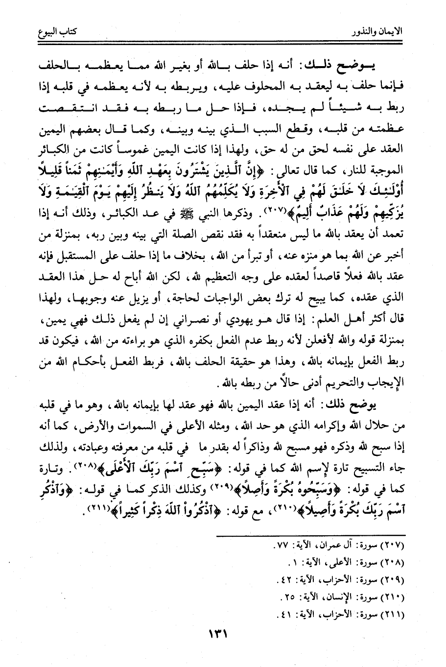 يُوَضِّحُ ذَلِكَ: أَنَّهُ إذَا عَقَدَ الْيَمِينَ بِاَللَّهِ فَهُوَ عَقْدٌ لَهَا بِإِيمَانِهِ بِاَللَّهِ، وَهُوَ مَا فِي قَلْبِهِ مِنْ حَلَالِ اللَّهِ وَإِكْرَامِهِ الَّذِي هُوَ حَدُّ اللَّهِ، وَمَثَلُهُ الْأَعْلَى فِي السَّمَاوَاتِ وَالْأَرْضِ، كَمَا أَنَّهُ إذَا سَبَّحَ لِلَّهِ وَذَكَرَهُ فَهُوَ مُسَبِّحٌ لِلَّهِ وَذَاكِرًا لَهُ بِقَدْرِ مَا فِي قَلْبِهِ مِنْ مَعْرِفَتِهِ وَعِبَادَتِهِ، وَلِذَلِكَ جَاءَ التَّسْبِيحُ تَارَةً لِاسْمِ اللَّهِ كَمَا فِي قَوْلِهِ: {سَبِّحِ اسْمَ رَبِّكَ الأَعْلَى} [الأعلى: 1] .