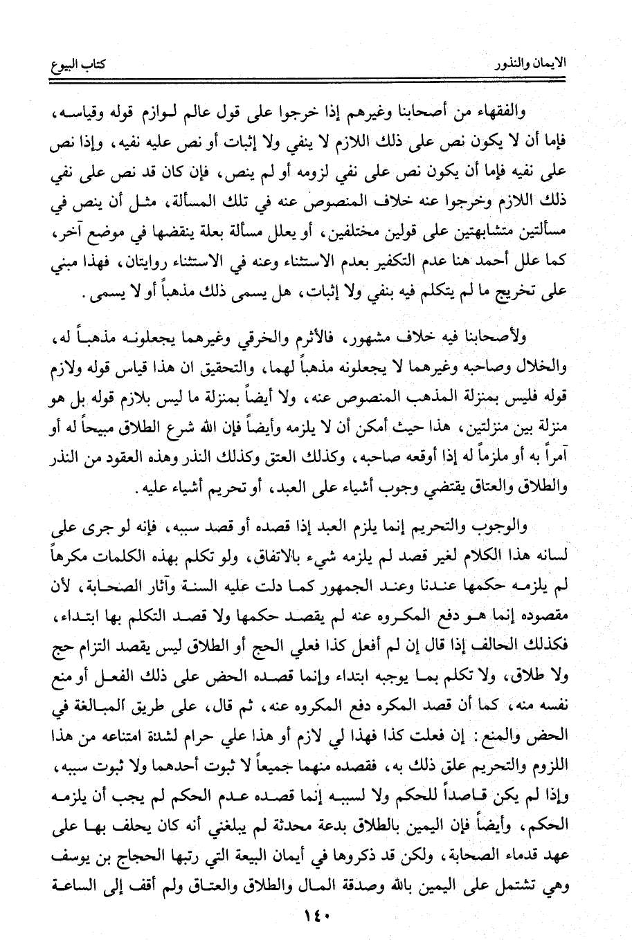 وَلِأَصْحَابِنَا فِيهِ خِلَافٌ مَشْهُورٌ، فَالْأَثْرَمُ وَالْخِرَقِيُّ وَغَيْرُهُمَا يَجْعَلُونَهُ مَذْهَبًا لَهُ، وَالْخَلَّالُ وَصَاحِبُهُ وَغَيْرُهُمَا لَا يَجْعَلُونَهُ مَذْهَبًا لَهُمَا، وَالتَّحْقِيقُ أَنَّ هَذَا قِيَاسُ قَوْلِهِ وَلَازِمُ قَوْلِهِ فَلَيْسَ بِمَنْزِلَةِ الْمَذْهَبِ الْمَنْصُوصِ عَنْهُ، وَلَا أَيْضًا بِمَنْزِلَةِ مَا لَيْسَ بِلَازِمِ قَوْلِهِ بَلْ هُوَ مَنْزِلَةٌ بَيْنَ مَنْزِلَتَيْنِ، هَذَا حَيْثُ أَمْكَنَ أَنْ لَا يَلْزَمَهُ وَأَيْضًا فَإِنَّ اللَّهَ شَرَعَ الطَّلَاقَ مُبِيحًا لَهُ أَوْ آمِرًا بِهِ أَوْ مُلْزِمًا لَهُ إذَا أَوْقَعَهُ صَاحِبُهُ، وَكَذَلِكَ الْعِتْقُ وَكَذَلِكَ النَّذْرُ وَهَذِهِ الْعُقُودُ مِنْ النَّذْرِ وَالطَّلَاقِ وَالْعَتَاقِ يَقْتَضِي وُجُوبَ أَشْيَاءَ عَلَى الْعَبْدِ، أَوْ تَحْرِيمَ أَشْيَاءَ عَلَيْهِ.