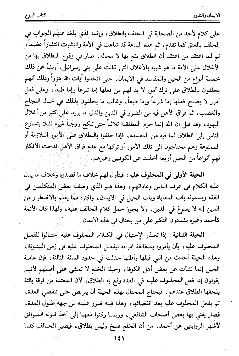 الْحِيلَةُ الْأُولَى فِي الْمَحْلُوفِ عَلَيْهِ: فَيَتَأَوَّلُ لَهُمْ خِلَافٌ قَصَدُوهُ وَخِلَافُ مَا يَدُلُّ عَلَيْهِ الْكَلَامُ فِي عُرْفِ النَّاسِ وَعَادَاتِهِمْ، وَهَذَا هُوَ الَّذِي وَصَفَهُ بَعْضُ الْمُتَكَلِّمِينَ فِي الْفِقْهِ وَيُسَمُّونَهُ بَابَ الْمُعَايَاةِ وَبَابَ الْحِيَلِ فِي الْأَيْمَانِ، وَأَكْثَرُهُ مِمَّا يُعْلَمُ بِالِاضْطِرَارِ مِنْ الدِّينِ أَنَّهُ لَا يَسُوغُ فِي الدِّينِ، وَلَا يَجُوزُ حَمْلُ كَلَامِ الْحَالِفِ عَلَيْهِ، وَلِهَذَا كَانَ الْأَئِمَّةُ كَأَحْمَدَ وَغَيْرِهِ يُشَدِّدُونَ النَّكِيرَ عَلَى مَنْ يَحْتَالُ فِي هَذِهِ الْأَيْمَانِ.
