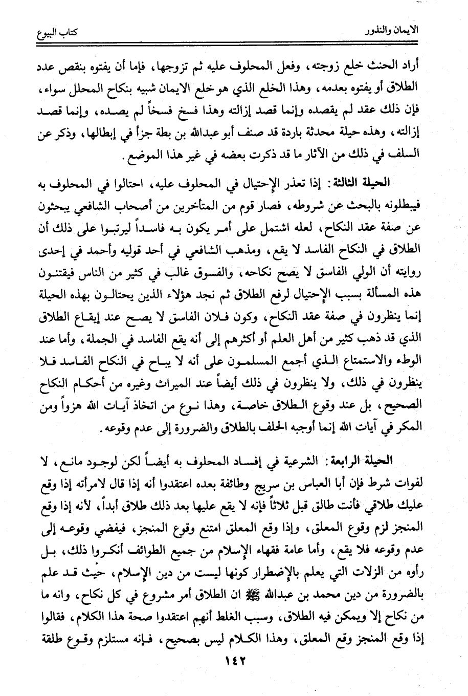الْحِيلَةُ الثَّالِثَةُ: إذَا تَعَذَّرَ الِاحْتِيَالُ فِي الْمَحْلُوفِ عَلَيْهِ، احْتَالُوا فِي الْمَحْلُوفِ بِهِ فَيُبْطِلُونَهُ بِالْبَحْثِ عَنْ شُرُوطِهِ، فَصَارَ قَوْمٌ مِنْ الْمُتَأَخِّرِينَ مِنْ أَصْحَابِ الشَّافِعِيِّ يَبْحَثُونَ عَنْ صِفَةِ عَقْدِ النِّكَاحِ، لَعَلَّهُ اشْتَمَلَ عَلَى أَمْرٍ يَكُونُ بِهِ فَاسِدًا لِيُرَتِّبُوا عَلَى ذَلِكَ أَنَّ الطَّلَاقَ فِي النِّكَاحِ الْفَاسِدِ لَا يَقَعُ، وَمَذْهَبُ الشَّافِعِيِّ فِي أَحَدِ قَوْلَيْهِ وَأَحْمَدُ فِي إحْدَى رِوَايَتَيْهِ أَنَّ الْوَلِيَّ الْفَاسِقَ لَا يَصِحُّ نِكَاحُهُ، وَالْفُسُوقُ غَالِبٌ فِي كَثِيرٍ مِنْ النَّاسِ فَيَقْتَنُونَ هَذِهِ الْمَسْأَلَةَ بِسَبَبِ الِاحْتِيَالِ لِرَفْعِ الطَّلَاقِ ثُمَّ نَجِدُ هَؤُلَاءِ الَّذِينَ يَحْتَالُونَ بِهَذِهِ الْحِيلَةِ إنَّمَا يَنْظُرُونَ فِي صِفَةِ عَقْدِ النِّكَاحِ، وَكَوْنُ فُلَانٍ الْفَاسِقِ لَا يَصِحُّ عِنْدَ إيقَاعِ الطَّلَاقِ الَّذِي قَدْ ذَهَبَ كَثِيرٌ مِنْ أَهْلِ الْعِلْمِ أَوْ أَكْثَرُهُمْ إلَى أَنَّهُ يَقَعُ الْفَاسِدُ فِي الْجُمْلَةِ، وَأَمَّا عِنْدَ الْوَطْءِ وَالِاسْتِمْتَاعِ الَّذِي أَجْمَع الْمُسْلِمُونَ عَلَى أَنَّهُ لَا يُبَاحُ فِي النِّكَاحِ الْفَاسِدِ فَلَا يَنْظُرُونَ فِي ذَلِكَ، وَلَا يَنْظُرُونَ فِي ذَلِكَ أَيْضًا عِنْدَ الْمِيرَاثِ وَغَيْرِهِ مِنْ أَحْكَامِ النِّكَاحِ الصَّحِيحِ، بَلْ عِنْدَ وُقُوعِ الطَّلَاقِ خَاصَّةً، وَهَذَا نَوْعٌ مِنْ اتِّخَاذِ آيَاتِ اللَّهِ هُزُوًا وَمِنْ الْمَكْرِ فِي آيَاتِ اللَّهِ إنَّمَا أَوْجَبَهُ الْحَلِفُ بِالطَّلَاقِ وَالضَّرُورَةِ إلَى عَدَمِ وُقُوعِهِ.