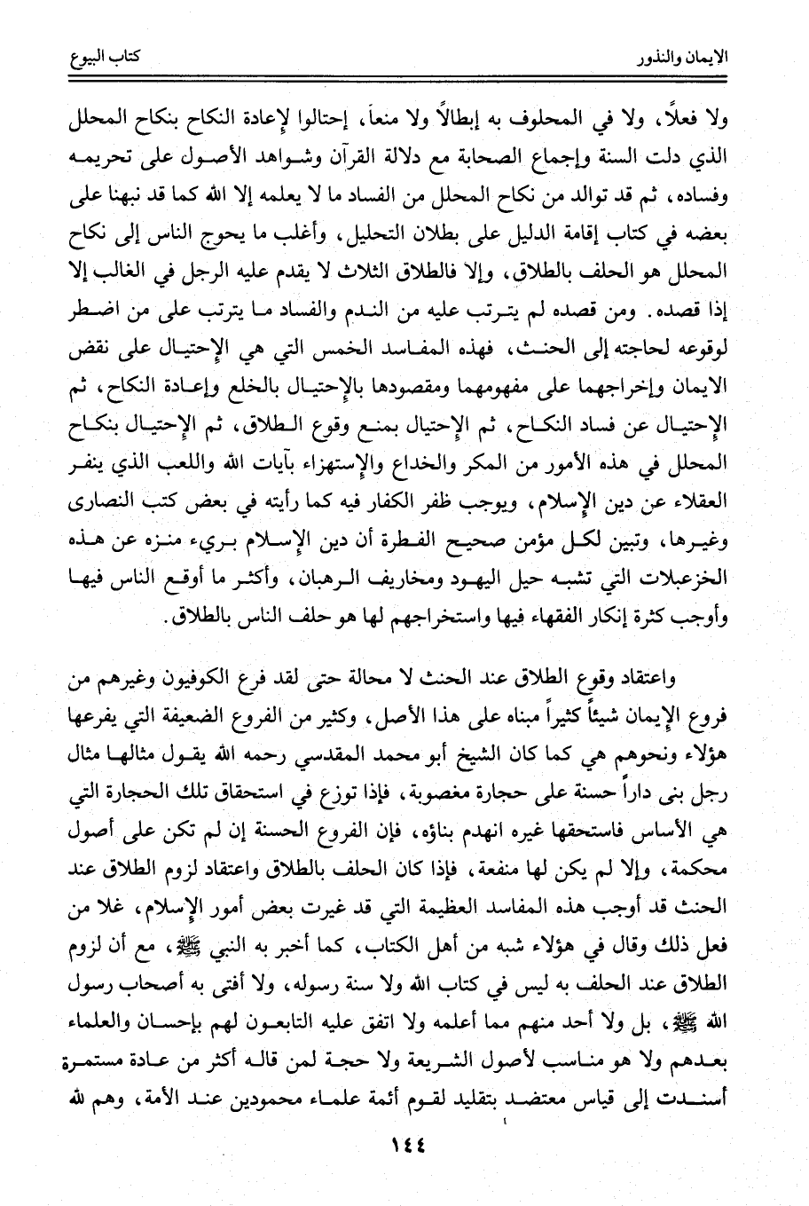 وَاعْتِقَادُ وُقُوعِ الطَّلَاقِ عِنْدَ الْحِنْثِ لَا مَحَالَةَ حَتَّى لَقَدْ فَرَّعَ الْكُوفِيُّونَ وَغَيْرُهُمْ مِنْ فُرُوعِ الْأَيْمَانِ شَيْئًا كَثِيرًا مَبْنَاهُ عَلَى هَذَا الْأَصْلِ، وَكَثِيرٌ مِنْ الْفُرُوعِ الضَّعِيفَةِ الَّتِي يُفَرِّعُهَا هَؤُلَاءِ وَنَحْوُهُمْ هِيَ كَمَا كَانَ الشَّيْخُ أَبُو مُحَمَّدٍ الْمَقْدِسِيُّ - رَحِمَهُ اللَّهُ - يَقُولُ مِثَالُهَا مِثَالُ رَجُلٍ بَنَى دَارًا حَسَنَةً عَلَى حِجَارَةٍ مَغْصُوبَةٍ، فَإِذَا تَوَزَّعَ فِي اسْتِحْقَاقِ تِلْكَ الْحِجَارَةِ الَّتِي هِيَ الْأَسَاسُ فَاسْتَحَقَّهَا غَيْرُهُ انْهَدَمَ بِنَاؤُهُ، فَإِنَّ الْفُرُوعَ الْحَسَنَةَ إنْ لَمْ تَكُنْ عَلَى أُصُولٍ مُحْكَمَةٍ، وَإِلَّا لَمْ يَكُنْ لَهَا مَنْفَعَةٌ، فَإِذَا كَانَ الْحَلِفُ بِالطَّلَاقِ وَاعْتِقَادُ لُزُومِ الطَّلَاقِ عِنْدَ الْحِنْثِ قَدْ أَوْجَبَ هَذِهِ الْمَفَاسِدَ الْعَظِيمَةَ الَّتِي قَدْ غَيَّرَتْ بَعْضَ أُمُورِ الْإِسْلَامِ، غَلَّا مِنْ فِعْلِ ذَلِكَ وَقَالَ فِي هَؤُلَاءِ شَبَهٌ مِنْ أَهْلِ الْكِتَابِ، كَمَا أَخْبَرَ بِهِ النَّبِيُّ. مَعَ أَنَّ لُزُومَ الطَّلَاقِ عِنْدَ الْحَلِفِ بِهِ لَيْسَ فِي كِتَابِ اللَّهِ وَلَا سُنَّةِ رَسُولِهِ، وَلَا أَفْتَى بِهِ أَصْحَابُ رَسُولِ اللَّهِ. بَلْ وَلَا أَحَدٌ مِنْهُمْ مِمَّا أَعْلَمُهُ وَلَا اتَّفَقَ عَلَيْهِ التَّابِعُونَ لَهُمْ بِإِحْسَانٍ وَالْعُلَمَاءُ بَعْدَهُمْ وَلَا هُوَ مُنَاسِبٌ لِأُصُولِ الشَّرِيعَةِ وَلَا حُجَّةَ لِمَنْ قَالَهُ أَكْثَرَ مِنْ عَادَةٍ مُسْتَمِرَّةٍ أُسْنِدَتْ إلَى قِيَاسٍ مُعْتَضَدٍ بِتَقْلِيدٍ لِقَوْمٍ أَئِمَّةٍ عُلَمَاءَ مَحْمُودِينَ عِنْدَ الْأُمَّةِ، وَهُمْ لِلَّهِ
