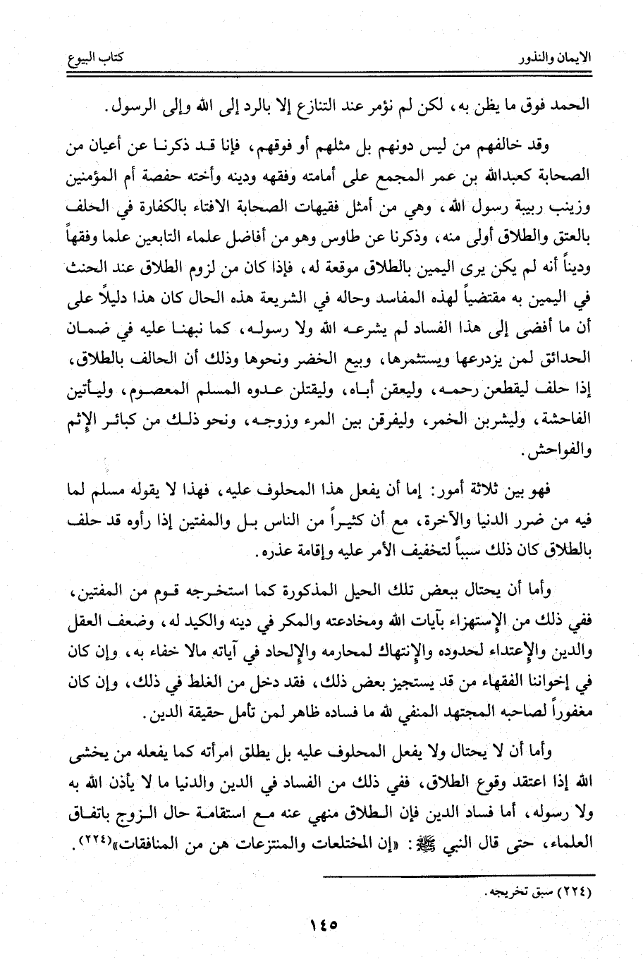 وَإِمَّا أَنْ لَا يَحْتَالَ وَلَا يَفْعَلَ الْمَحْلُوفَ عَلَيْهِ بَلْ يُطَلِّقُ امْرَأَتَهُ كَمَا يَفْعَلُهُ مَنْ يَخْشَى اللَّهَ إذَا اعْتَقَدَ وُقُوعَ الطَّلَاقِ، فَفِي ذَلِكَ مِنْ الْفَسَادِ فِي الدِّينِ وَالدُّنْيَا مَا لَا يَأْذَنْ اللَّهُ بِهِ وَلَا رَسُولُهُ، أَمَّا فَسَادُ الدِّينِ فَإِنَّ الطَّلَاقَ مَنْهِيٌّ عَنْهُ مَعَ اسْتِقَامَةِ حَالِ الزَّوْجِ بِاتِّفَاقِ الْعُلَمَاءِ، حَتَّى قَالَ النَّبِيُّ «إنَّ الْمُخْتَلِعَاتِ وَالْمُنْتَزِعَاتِ هُنَّ مِنْ الْمُنَافِقَاتِ» .