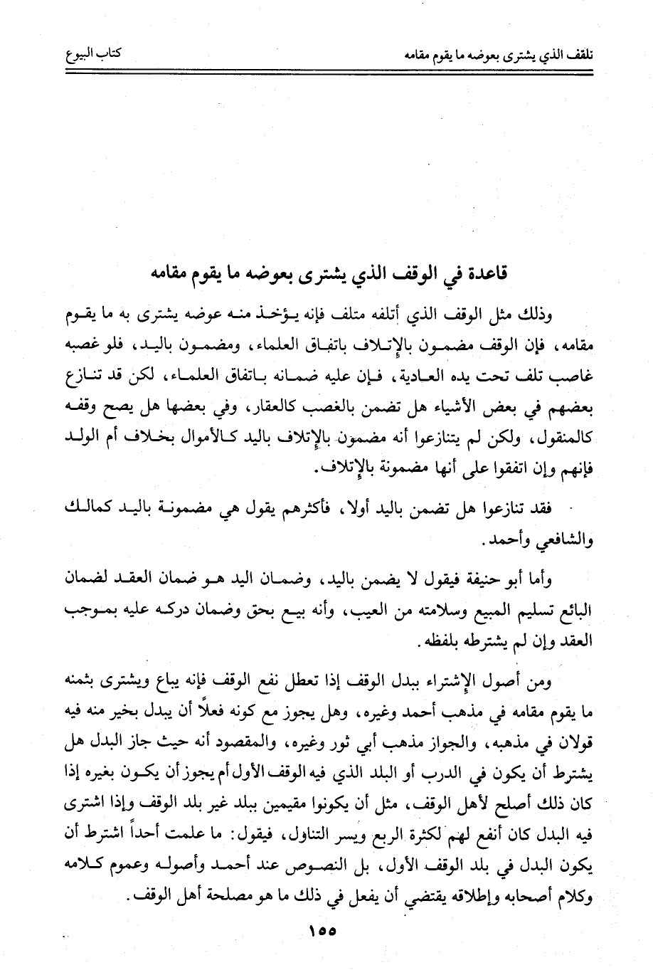 مِنْ أُصُولِ الِاشْتِرَاءِ بِبَدَلِ الْوَقْفِ إذَا تَعَطَّلَ نَفْعُ الْوَقْفِ فَإِنَّهُ يُبَاعُ وَيُشْتَرَى بِثَمَنِهِ مَا يَقُومُ مَقَامَهُ فِي مَذْهَبِ أَحْمَدَ وَغَيْرِهِ، وَهَلْ يَجُوزُ مَعَ كَوْنِهِ فِعْلًا أَنْ يُبَدَّلَ بِخَيْرٍ مِنْهُ فِيهِ قَوْلَانِ فِي مَذْهَبِهِ، وَالْجَوَازُ مَذْهَبُ أَبِي ثَوْرٍ وَغَيْرِهِ، وَالْمَقْصُودُ أَنَّهُ حَيْثُ جَازَ الْبَدَلُ هَلْ يُشْتَرَطُ أَنْ يَكُونَ فِي الدَّرْبِ أَوْ الْبَلَدِ الَّذِي فِيهِ الْوَقْفُ الْأَوَّلُ أَمْ يَجُوزُ أَنْ يَكُونَ بِغَيْرِهِ إذَا كَانَ ذَلِكَ أَصْلَحَ لِأَهْلِ الْوَقْفِ، مِثْلَ أَنْ يَكُونُوا مُقِيمِينَ بِبَلَدٍ غَيْرِ بَلَدِ الْوَقْفِ وَإِذَا اشْتَرَى فِيهِ الْبَدَلَ كَانَ أَنْفَعَ لَهُمْ لِكَثْرَةِ الرُّبُعِ وَيُسْرِ التَّنَاوُلِ، فَيَقُولُ: مَا عَلِمْت أَحَدًا اشْتَرَطَ أَنْ يَكُونَ الْبَدَلُ فِي بَلَدِ الْوَقْفِ الْأَوَّلِ، بَلْ النُّصُوصُ عِنْدَ أَحْمَدَ وَأُصُولِهِ وَعُمُومُ كَلَامِهِ وَكَلَامِ أَصْحَابِهِ وَإِطْلَاقُهُ يَقْتَضِي أَنْ يُفْعَلَ فِي ذَلِكَ مَا هُوَ مَصْلَحَةُ أَهْلِ الْوَقْفِ.