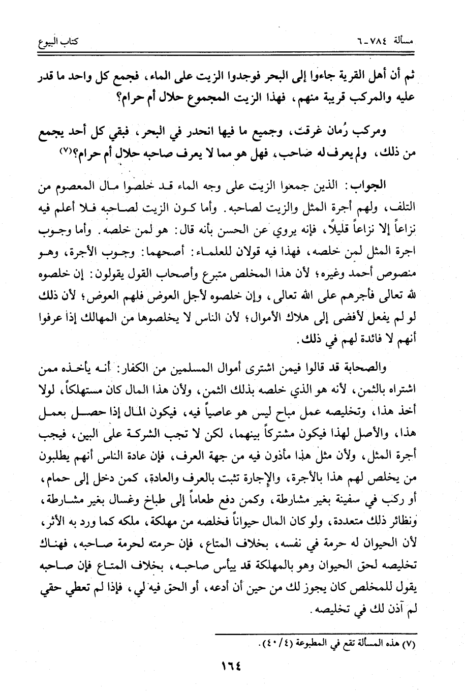 الْجَوَابُ: الَّذِينَ جَمَعُوا الزَّيْتَ عَلَى وَجْهِ الْمَاءِ قَدْ خَلَّصُوا مَالَ الْمَعْصُومِ مِنْ التَّلَفِ، وَلَهُمْ أُجْرَةُ الْمِثْلِ وَالزَّيْتُ لِصَاحِبِهِ. وَأَمَّا كَوْنُ الزَّيْتِ لِصَاحِبِهِ فَلَا أَعْلَمُ فِيهِ نِزَاعًا إلَّا نِزَاعًا قَلِيلًا، فَإِنَّهُ يُرْوَى عَنْ الْحَسَنِ بِأَنَّهُ قَالَ: هُوَ لِمَنْ خَلَّصَهُ. وَأَمَّا وُجُوبُ أُجْرَةِ الْمِثْلِ لِمَنْ خَلَّصَهُ، فَهَذَا فِيهِ قَوْلَانِ لِلْعُلَمَاءِ: أَصَحُّهُمَا: وُجُوبُ الْأُجْرَةِ، وَهُوَ مَنْصُوصُ أَحْمَدَ وَغَيْرِهِ؛ لِأَنَّ هَذَا الْمُخَلِّصَ مُتَبَرِّعٌ وَأَصْحَابُ الْقَوْلِ يَقُولُونَ: إنْ خَلَّصُوهُ لِلَّهِ تَعَالَى فَأَجْرُهُمْ عَلَى اللَّهِ تَعَالَى، وَإِنْ خَلَصُوهُ لِأَجْلِ الْعِوَضِ فَلَهُمْ الْعِوَضُ؛ لِأَنَّ ذَلِكَ لَوْ لَمْ يُفْعَلْ لَأَفْضَى إلَى هَلَاكِ الْأَمْوَالِ؛ لِأَنَّ النَّاسَ لَا يُخَلِّصُوهَا مِنْ الْمَهَالِكِ إذَا عَرَفُوا أَنَّهُمْ لَا فَائِدَةَ لَهُمْ فِي ذَلِكَ.