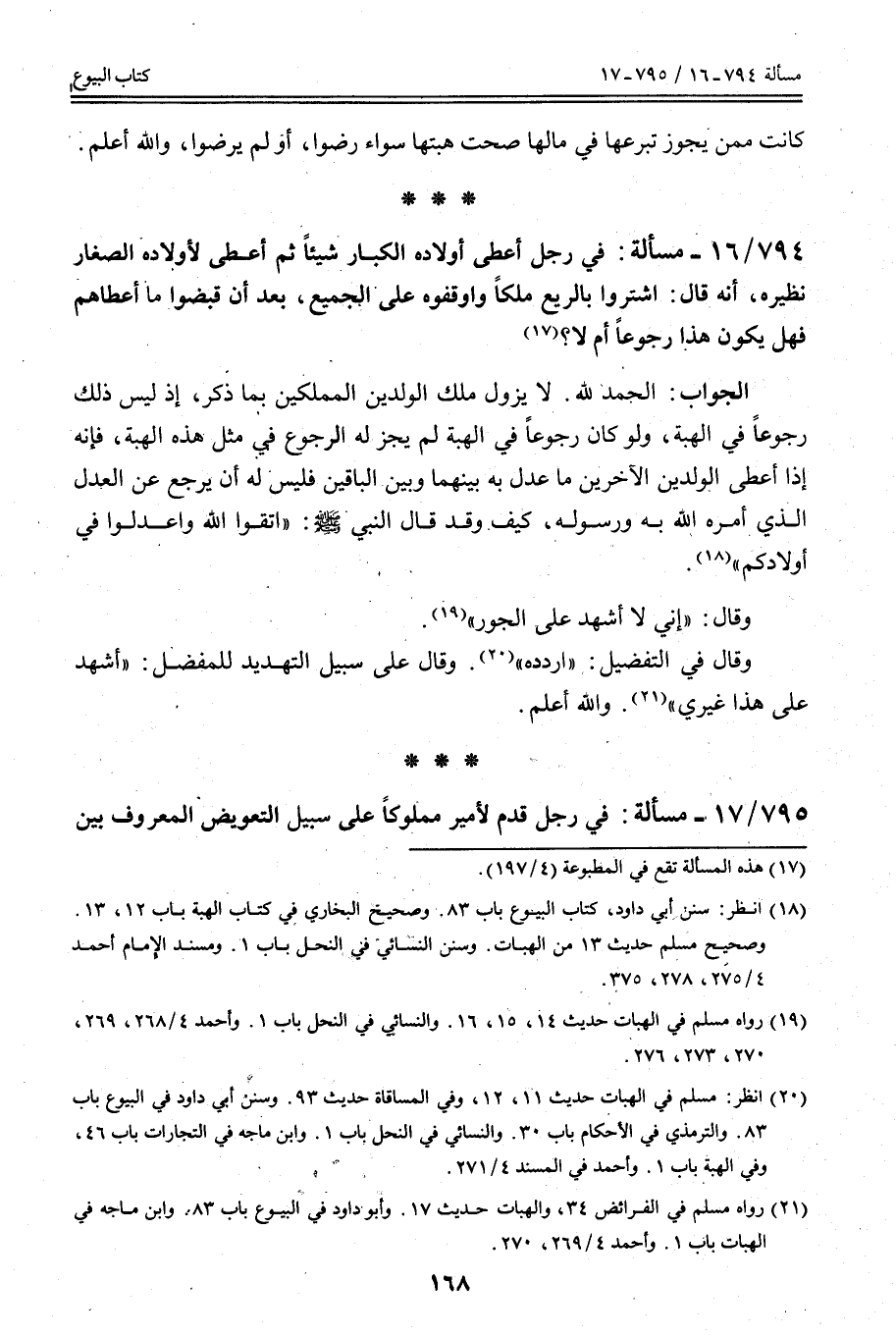 وَقَالَ: " إنِّي لَا أَشْهَدُ عَلَى الْجَوْرِ ". وَقَالَ فِي التَّفْضِيلِ: " اُرْدُدْهُ ". وَقَالَ عَلَى سَبِيلِ التَّهْدِيدِ لِلْمُفَضِّلِ: " أَشْهِدْ عَلَى هَذَا غَيْرِي ". وَاَللَّهُ أَعْلَمُ.