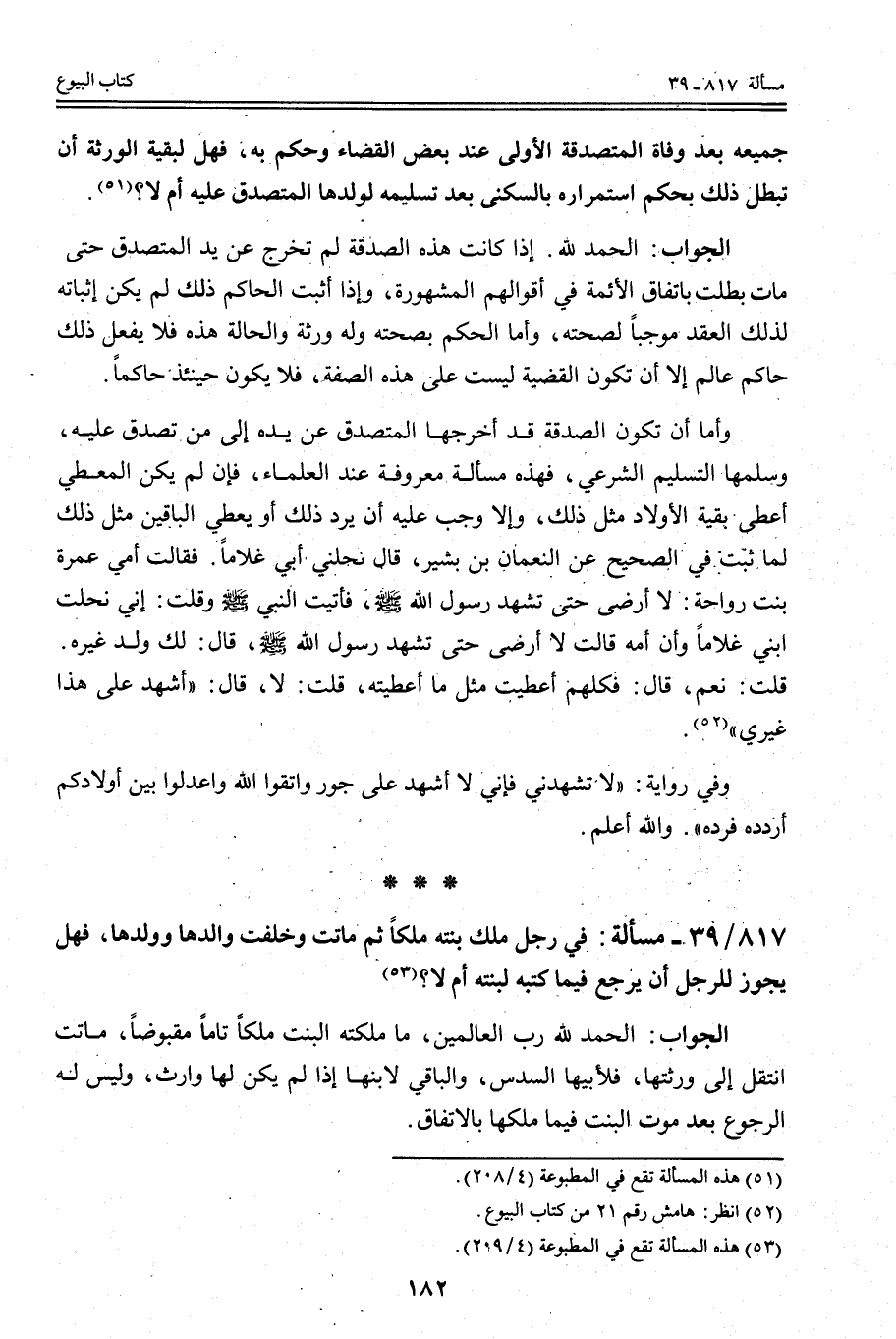 وَأَمَّا أَنْ تَكُونَ الصَّدَقَةُ قَدْ أَخْرَجَهَا الْمُتَصَدِّقُ عَنْ يَدِهِ إلَى مَنْ تَصَدَّقَ عَلَيْهِ، وَسَلَّمَهَا التَّسْلِيمَ الشَّرْعِيَّ، فَهَذِهِ مَسْأَلَةٌ مَعْرُوفَةٌ عِنْدَ الْعُلَمَاءِ، فَإِنْ لَمْ يَكُنْ الْمُعْطِي أَعْطَى بَقِيَّةَ الْأَوْلَادِ مِثْلَ ذَلِكَ، وَإِلَّا وَجَبَ عَلَيْهِ أَنْ يَرُدَّ ذَلِكَ أَوْ يُعْطِيَ الْبَاقِينَ مِثْلَ ذَلِكَ لِمَا ثَبَتَ فِي الصَّحِيحِ عَنْ النُّعْمَانِ بْنِ بَشِيرٍ، «قَالَ نَحَلَنِي أَبِي غُلَامًا. فَقَالَتْ أُمِّي عَمْرَةُ بِنْتُ رَوَاحَةَ: لَا أَرْضَى حَتَّى تُشْهِدَ رَسُولَ اللَّهِ، فَأَتَيْت النَّبِيَّ وَقُلْت: إنِّي نَحَلْت ابْنِي غُلَامًا وَإِنَّ أُمَّهُ قَالَتْ لَا أَرْضَى حَتَّى تُشْهِدَ رَسُولَ اللَّهِ، قَالَ: لَك وَلَدٌ غَيْرُهُ. قُلْت: نَعَمْ، قَالَ: فَكُلُّهُمْ أَعْطَيْت مِثْلَ مَا أَعْطَيْته، قُلْت: لَا، قَالَ: أَشْهِدْ عَلَى هَذَا غَيْرِي» . وَفِي رِوَايَةٍ: «لَا تُشْهِدْنِي فَإِنِّي لَا أَشْهَدُ عَلَى جَوْرٍ وَاتَّقُوا اللَّهَ وَاعْدِلُوا بَيْنَ أَوْلَادِكُمْ اُرْدُدْهُ فَرَدَّهُ» .