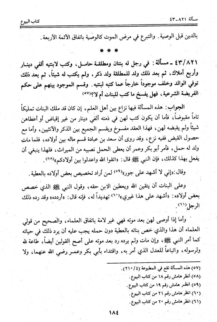 821 - 43 - مَسْأَلَةٌ: فِي رَجُلٍ لَهُ بِنْتَانِ وَمُطَلَّقَةٌ حَامِلٌ، وَكَتَبَ لِابْنَتَيْهِ أَلْفَيْ دِينَارٍ وَأَرْبَعِ أَمْلَاكٍ، ثُمَّ بَعْدَ ذَلِكَ وُلِدَ لِلْمُطَلَّقَةِ وَلَدٌ ذَكَرٌ، وَلَمْ يَكْتُبْ لَهُ شَيْئًا، ثُمَّ بَعْدَ ذَلِكَ تُوُفِّيَ الْوَالِدُ وَخَلَفَ مَوْجُودًا خَارِجًا عَمَّا كَتَبَهُ لِبِنْتَيْهِ. وَقَسَمَ الْمَوْجُودَ بَيْنَهُمْ عَلَى حُكْمِ الْفَرِيضَةِ الشَّرْعِيَّةِ، فَهَلْ يُفْسَخُ مَا كَتَبَ لِلْبَنَاتِ أَمْ لَا؟