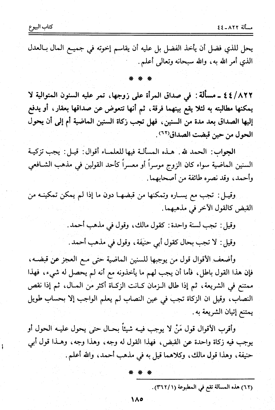 822 - 44 - مَسْأَلَةٌ: فِي صَدَاقِ الْمَرْأَةِ عَلَى زَوْجِهَا، تَمُرُّ عَلَيْهِ السُّنُونَ الْمُتَوَالِيَةُ لَا يُمْكِنُهَا مُطَالَبَتُهُ بِهِ لِئَلَّا يَقَعَ بَيْنَهُمَا فُرْقَةٌ، ثُمَّ إنَّهَا تَتَعَوَّضُ عَنْ صَدَاقِهَا بِعَقَارٍ، أَوْ يَدْفَعُ إلَيْهَا الصَّدَاقَ بَعْدَ مُدَّةٍ مِنْ السِّنِينَ، فَهَلْ تَجِبُ زَكَاةُ السِّنِينَ الْمَاضِيَةِ أَمْ إلَى أَنْ يَحُولَ الْحَوْلُ مِنْ حِينِ قَبَضَتْ الصَّدَاقَ.