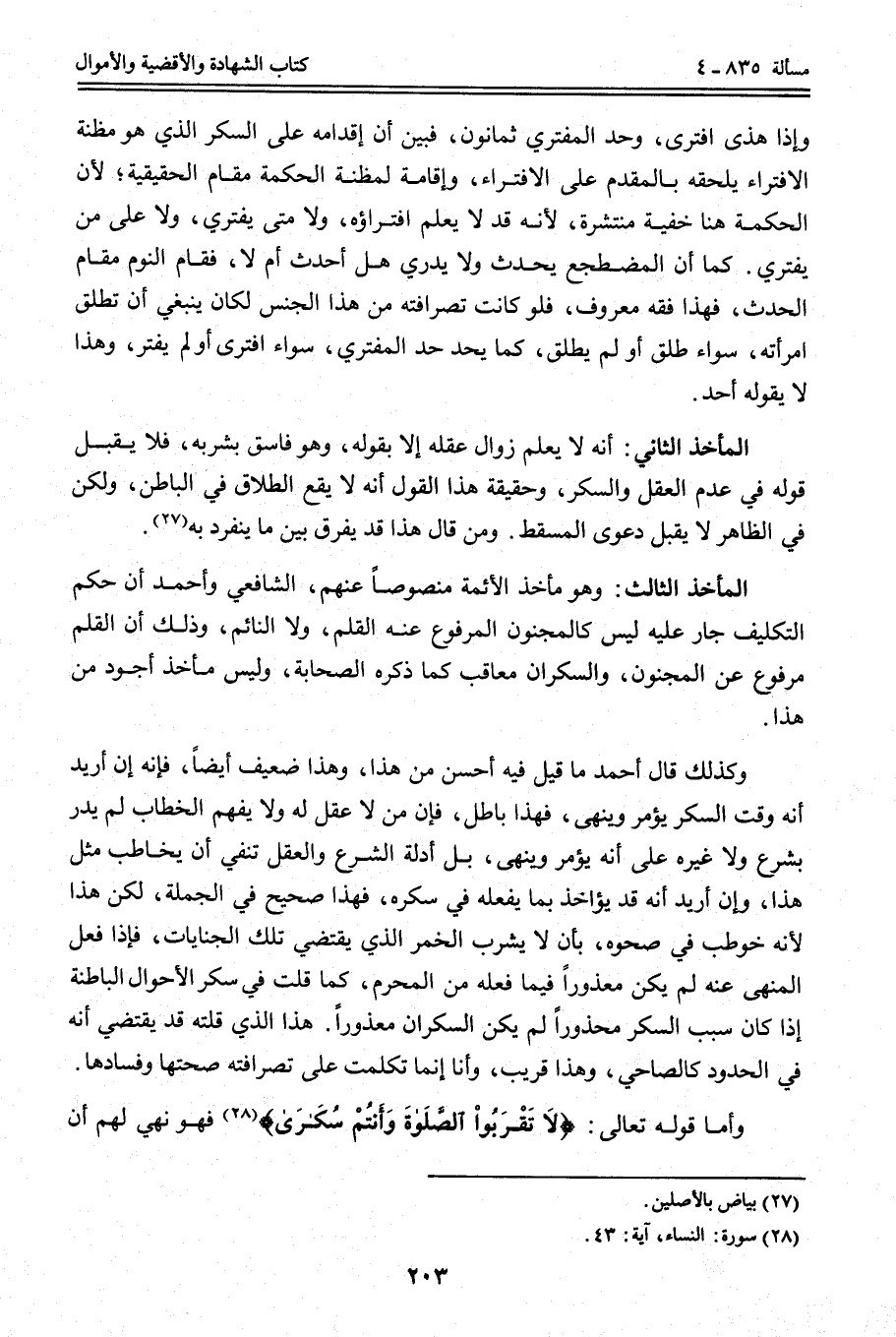 الْمَأْخَذُ الثَّالِثُ: وَهُوَ مَأْخَذُ الْأَئِمَّةِ مَنْصُوصًا عَنْهُمْ، الشَّافِعِيُّ وَأَحْمَدُ أَنَّ حُكْمَ التَّكْلِيفِ جَارٍ عَلَيْهِ لَيْسَ كَالْمَجْنُونِ الْمَرْفُوعِ عَنْهُ الْقَلَمُ، وَلَا النَّائِمِ، وَذَلِكَ أَنَّ الْقَلَمَ مَرْفُوعٌ عَنْ الْمَجْنُونِ، وَالسَّكْرَانُ مُعَاقَبٌ كَمَا ذَكَرَهُ الصَّحَابَةُ، وَلَيْسَ مَأْخَذٌ أَجْوَدَ مِنْ هَذَا.