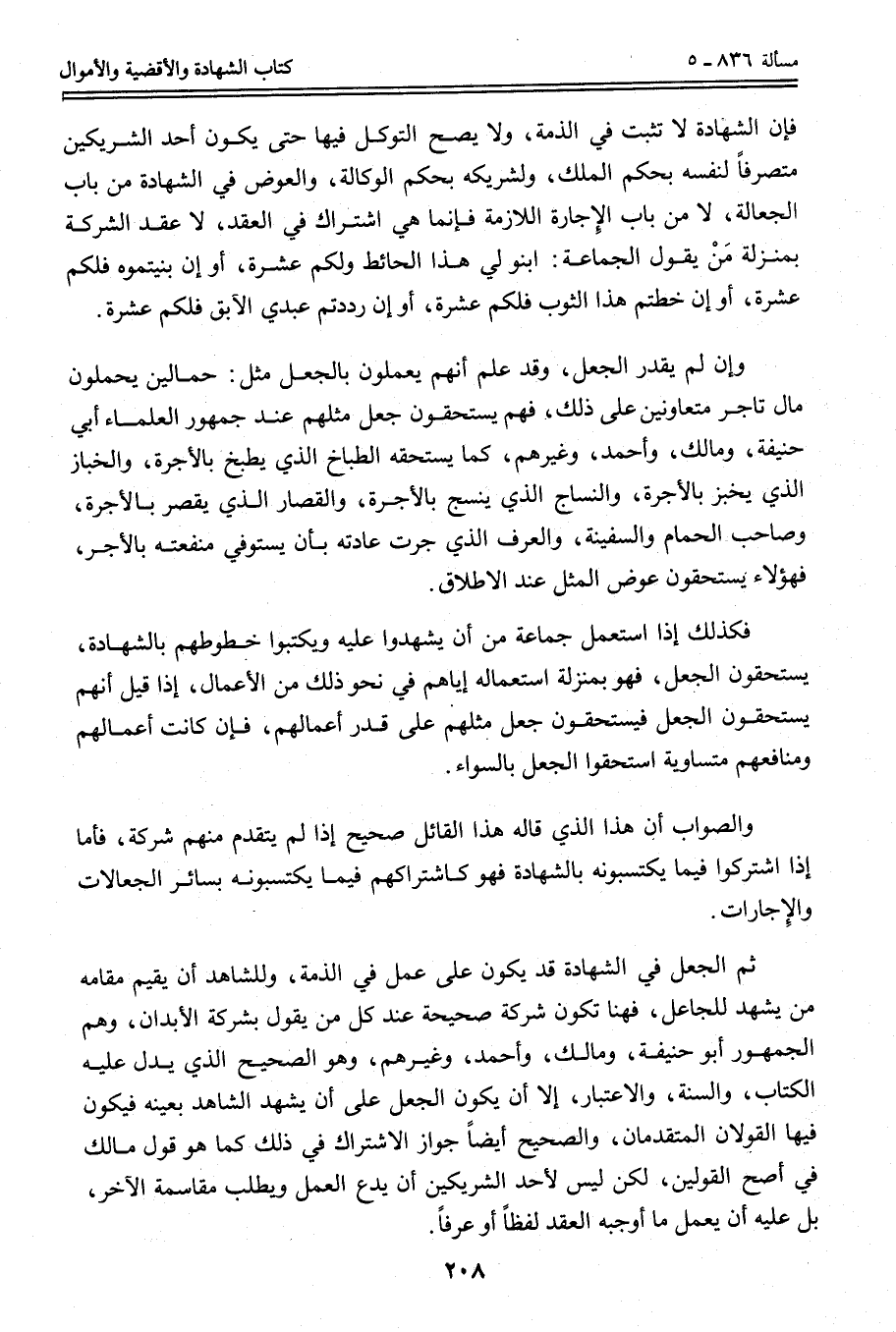 فَإِنَّ الشَّهَادَةَ لَا تَثْبُتُ فِي الذِّمَّةِ، وَلَا يَصِحُّ التَّوَكُّلُ فِيهَا حَتَّى يَكُونَ أَحَدُ الشَّرِيكَيْنِ مُتَصَرِّفًا لِنَفْسِهِ بِحُكْمِ الْمِلْكِ، وَلِشَرِيكِهِ بِحُكْمِ الْوَكَالَةِ، وَالْعِوَضُ فِي الشَّهَادَةِ مِنْ بَابِ الْجَعَالَةِ، لَا مِنْ بَابِ الْإِجَارَةِ اللَّازِمَةِ فَإِنَّمَا هِيَ اشْتِرَاكٌ فِي الْعَقْدِ، لَا عَقْدُ الشَّرِكَةِ بِمَنْزِلَةِ مَنْ يَقُولُ الْجَمَاعَة: ابْنُوا لِي هَذَا الْحَائِطَ وَلَكُمْ عَشَرَةٌ، أَوْ إنْ بَنَيْتُمُوهُ فَلَكُمْ عَشْرَةٌ، أَوْ إنْ خِطْتُمْ هَذَا الثَّوْبَ فَلَكُمْ عَشَرَةٌ، أَوْ إنْ رَدَدْتُمْ عَبْدِي الْآبِقَ فَلَكُمْ عَشَرَةٌ.