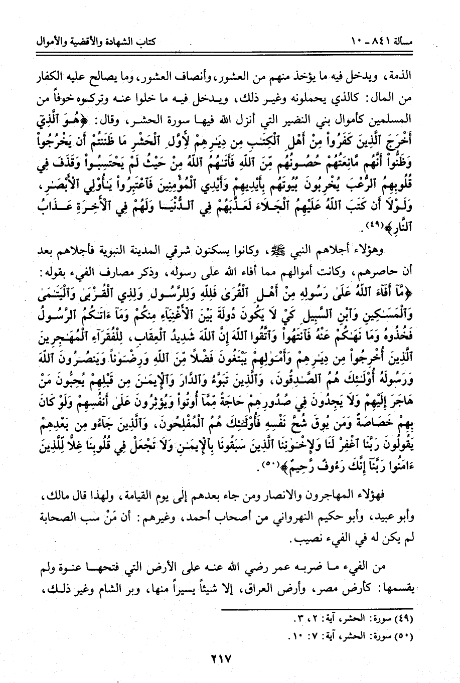 وَذَكَرَ مَصَارِفَ الْفَيْءِ بِقَوْلِهِ: {مَا أَفَاءَ اللَّهُ عَلَى رَسُولِهِ مِنْ أَهْلِ الْقُرَى فَلِلَّهِ وَلِلرَّسُولِ وَلِذِي الْقُرْبَى وَالْيَتَامَى وَالْمَسَاكِينِ وَابْنِ السَّبِيلِ كَيْ لا يَكُونَ دُولَةً بَيْنَ الأَغْنِيَاءِ مِنْكُمْ وَمَا آتَاكُمُ الرَّسُولُ فَخُذُوهُ وَمَا نَهَاكُمْ عَنْهُ فَانْتَهُوا وَاتَّقُوا اللَّهَ إِنَّ اللَّهَ شَدِيدُ الْعِقَابِ} [الحشر: 7] {لِلْفُقَرَاءِ الْمُهَاجِرِينَ الَّذِينَ أُخْرِجُوا مِنْ دِيَارِهِمْ وَأَمْوَالِهِمْ يَبْتَغُونَ فَضْلا مِنَ اللَّهِ وَرِضْوَانًا وَيَنْصُرُونَ اللَّهَ وَرَسُولَهُ أُولَئِكَ هُمُ الصَّادِقُونَ} [الحشر: 8] {وَالَّذِينَ تَبَوَّءُوا الدَّارَ وَالإِيمَانَ مِنْ قَبْلِهِمْ يُحِبُّونَ مَنْ هَاجَرَ إِلَيْهِمْ وَلا يَجِدُونَ فِي صُدُورِهِمْ حَاجَةً مِمَّا أُوتُوا وَيُؤْثِرُونَ عَلَى أَنْفُسِهِمْ وَلَوْ كَانَ بِهِمْ خَصَاصَةٌ وَمَنْ يُوقَ شُحَّ نَفْسِهِ فَأُولَئِكَ هُمُ الْمُفْلِحُونَ} [الحشر: 9] {وَالَّذِينَ جَاءُوا مِنْ بَعْدِهِمْ يَقُولُونَ رَبَّنَا اغْفِرْ لَنَا وَلإِخْوَانِنَا الَّذِينَ سَبَقُونَا بِالإِيمَانِ وَلا تَجْعَلْ فِي قُلُوبِنَا غِلا لِلَّذِينَ آمَنُوا رَبَّنَا إِنَّكَ رَءُوفٌ رَحِيمٌ} [الحشر: 10] .