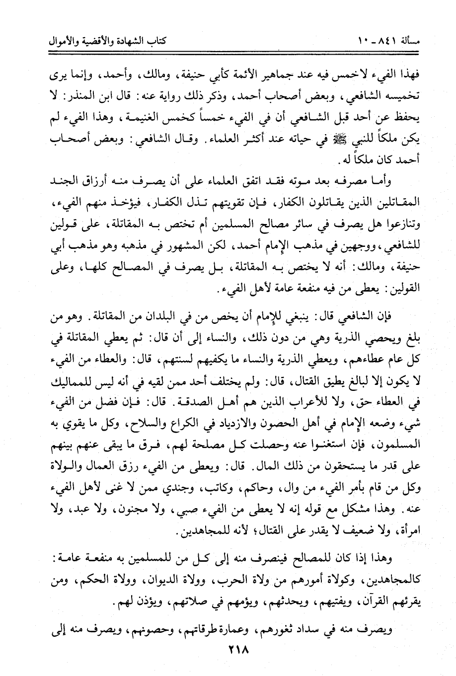 فَهَذَا الْفَيْءُ لَا خُمُسَ فِيهِ عِنْدَ جَمَاهِيرِ الْأَئِمَّةِ كَأَبِي حَنِيفَةَ، وَمَالِكٍ، وَأَحْمَدَ، وَإِنَّمَا يَرَى تَخْمِيسَهُ الشَّافِعِيُّ، وَبَعْضُ أَصْحَابِ أَحْمَدَ، وَذَكَرَ ذَلِكَ رِوَايَةً عَنْهُ: قَالَ ابْنُ الْمُنْذِرِ: لَا يُحْفَظُ عَنْ أَحَدٍ قَبْلَ الشَّافِعِيِّ أَنَّ فِي الْفَيْءِ خُمُسًا كَخُمُسِ الْغَنِيمَةِ، وَهَذَا الْفَيْءُ لَمْ يَكُنْ مِلْكًا لِلنَّبِيِّ - صَلَّى اللَّهُ عَلَيْهِ وَسَلَّمَ - فِي حَيَاتِهِ عِنْدَ أَكْثَرِ الْعُلَمَاءِ. وَقَالَ الشَّافِعِيُّ: وَبَعْضُ أَصْحَابِ أَحْمَدَ كَانَ مِلْكًا لَهُ.
