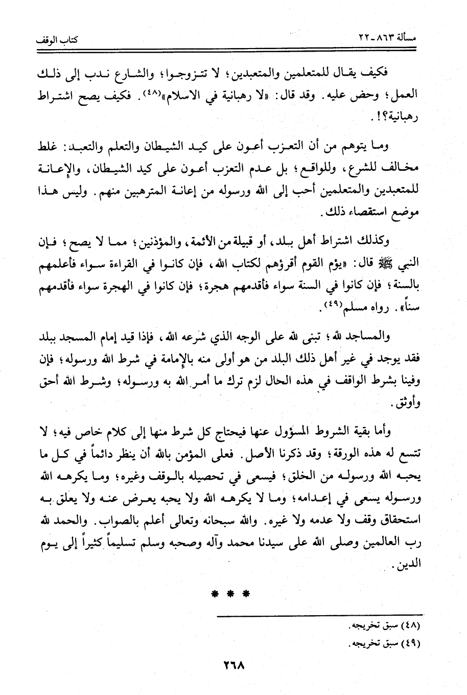 وَأَمَّا بَقِيَّةُ الشُّرُوطِ الْمَسْئُولِ عَنْهَا فَيَحْتَاجُ كُلُّ شَرْطٍ مِنْهَا إلَى كَلَامٍ خَاصٍّ فِيهِ؛ لَا تَتَّسِعُ لَهُ هَذِهِ الْوَرَقَةُ؛ وَقَدْ ذَكَرْنَا الْأَصْلَ. فَعَلَى الْمُؤْمِنِ بِاَللَّهِ أَنْ يَنْظُرَ دَائِمًا فِي كُلِّ مَا يُحِبُّهُ اللَّهُ وَرَسُولُهُ مِنْ الْخُلُقِ؛ فَيَسْعَى فِي تَحْصِيلِهِ بِالْوَقْفِ وَغَيْرِهِ؛ وَمَا يَكْرَهُهُ اللَّهُ وَرَسُولُهُ يَسْعَى فِي إعْدَامِهِ؛ وَمَا لَا يَكْرَهُهُ اللَّهُ وَلَا يُحِبُّهُ يُعْرِضُ عَنْهُ وَلَا يُعَلِّقُ بِهِ اسْتِحْقَاقَ وَقْفٍ وَلَا عَدَمَهَ وَلَا غَيْرَهُ. وَاَللَّهُ سُبْحَانَهُ وَتَعَالَى أَعْلَمُ بِالصَّوَابِ. وَالْحَمْدُ لِلَّهِ رَبِّ الْعَالَمِينَ وَصَلَّى اللَّهُ عَلَى سَيِّدِنَا مُحَمَّدٍ وَآلِهِ وَصَحْبِهِ وَسَلَّمَ تَسْلِيمًا كَثِيرًا إلَى يَوْمِ الدِّينِ.