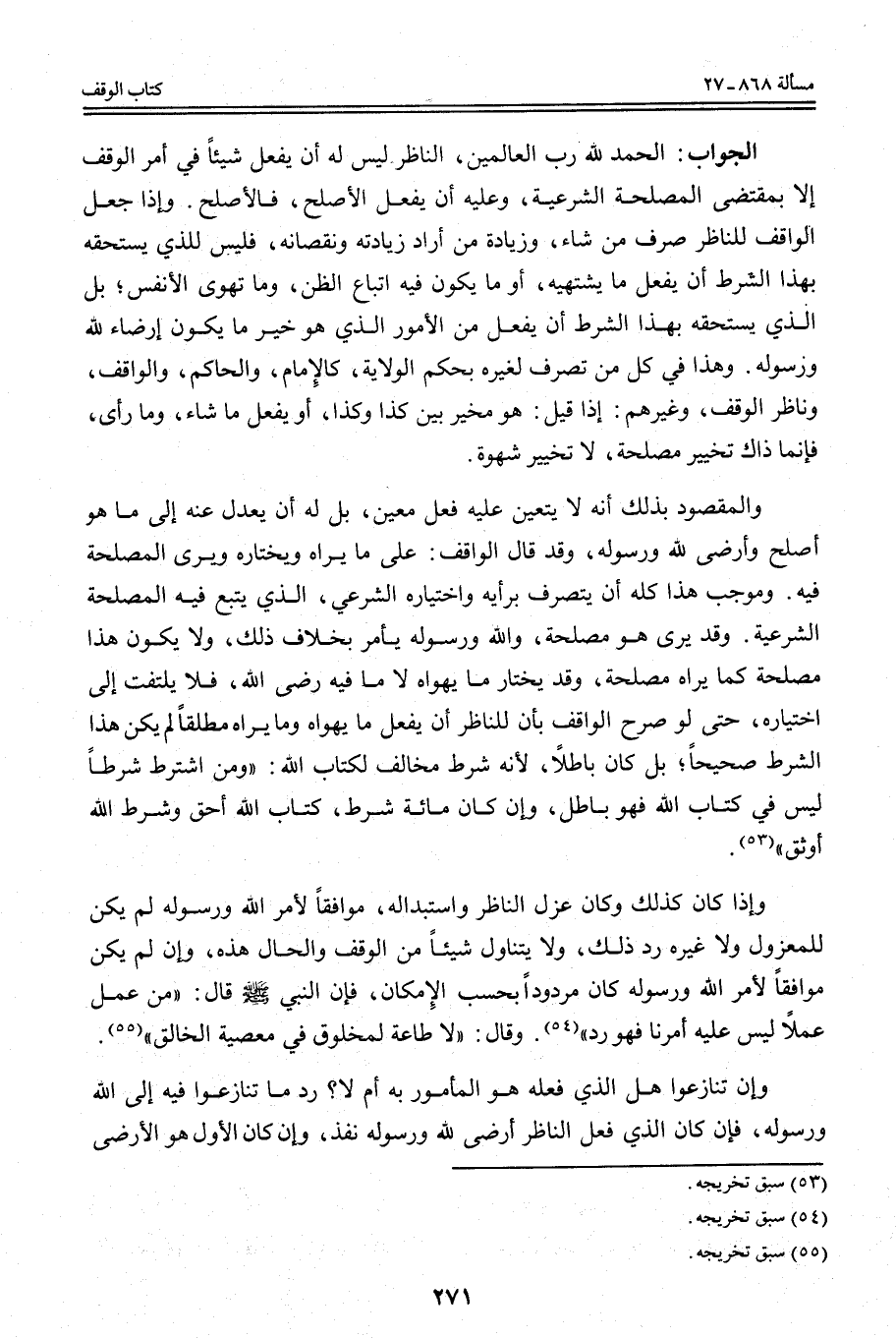 وَإِذَا كَانَ كَذَلِكَ وَكَانَ عَزْلُ النَّاظِرِ وَاسْتِبْدَالُهُ، مُوَافِقًا لِأَمْرِ اللَّهِ وَرَسُولِهِ لَمْ يَكُنْ لِلْمَعْزُولِ وَلَا غَيْرِهِ رَدُّ ذَلِكَ، وَلَا يَتَنَاوَلُ شَيْئًا مِنْ الْوَقْفِ وَالْحَالُ هَذِهِ، وَإِنْ لَمْ يَكُنْ مُوَافِقًا لِأَمْرِ اللَّهِ وَرَسُولِهِ كَانَ مَرْدُودًا بِحَسَبِ الْإِمْكَانِ، فَإِنَّ النَّبِيَّ قَالَ: «مَنْ عَمِلَ عَمَلًا لَيْسَ عَلَيْهِ أَمْرُنَا فَهُوَ رَدٌّ» .