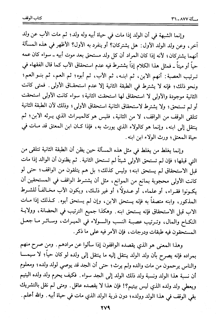 وَإِنَّمَا الشُّبْهَةُ فِي أَنَّ الْوَلَدَ إذَا مَاتَ فِي حَيَاةِ أَبِيهِ وَلَهُ وَلَدٌ؛ ثُمَّ مَاتَ الْأَبُ عَنْ وَلَدٍ آخَرَ، وَعَنْ وَلَدِ الْوَلَدِ الْأَوَّلِ: هَلْ يَشْتَرِكَانِ؟ أَوْ يَنْفَرِدُ بِهِ الْأَوَّلُ؟ الْأَظْهَرُ فِي هَذِهِ الْمَسْأَلَةِ أَنَّهُمَا يَشْتَرِكَانِ؛ لِأَنَّهُ إذَا كَانَ الْمُرَاد أَنَّ كُلَّ وَلَدٍ مُسْتَحِقٌّ بَعْدَ مَوْتِ أَبِيهِ - سَوَاءٌ كَانَ عَمُّهُ حَيًّا أَوْ مَيِّتًا - فَمِثْلُ هَذَا الْكَلَامِ إذًا يُشْتَرَطُ فِيهِ عَدَمُ اسْتِحْقَاقِ الْأَبِ كَمَا قَالَ الْفُقَهَاءُ فِي تَرْتِيبِ الْعَصَبَةِ: أَنَّهُمْ الِابْنُ، ثُمَّ ابْنُهُ، ثُمَّ الْأَبُ، ثُمَّ أَبُوهُ؛ ثُمَّ الْعَمُّ، ثُمَّ بَنُو الْعَمِّ؛ وَنَحْوُ ذَلِكَ؛ فَإِنَّهُ لَا يُشْتَرَطُ فِي الطَّبَقَةِ الثَّانِيَةِ إلَّا عَدَمُ اسْتِحْقَاقِ الْأُولَى.