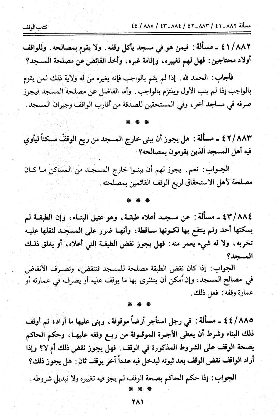 [مَسْأَلَةٌ هَلْ يَجُوزُ أَنْ يَبْنِيَ خَارِجَ الْمَسْجِدِ مِنْ رِيعِ الْوَقْفِ مَسْكَنًا لِيَأْوِيَ فِيهِ أَهْلُ الْمَسْجِدِ الَّذِينَ يَقُومُونَ بِمَصَالِحِهِ]