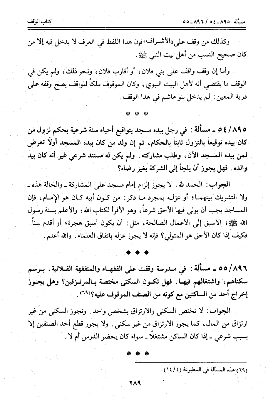 وَأَمَّا إنْ وَقَفَ وَاقِفٌ عَلَى بَنِي فُلَانٍ؛ أَوْ أَقَارِبِ فُلَانٍ، وَنَحْوِ ذَلِكَ، وَلَمْ يَكُنْ فِي الْوَقْفِ مَا يَقْتَضِي أَنَّهُ لِأَهْلِ الْبَيْت النَّبَوِيِّ، وَكَانَ الْمَوْقُوفُ مِلْكًا لِلْوَاقِفِ يَصِحُّ وَقْفُهُ عَلَى ذُرِّيَّةِ الْمُعِينِ: لَمْ يَدْخُلْ بَنُو هَاشِمٍ فِي هَذَا الْوَقْفِ.