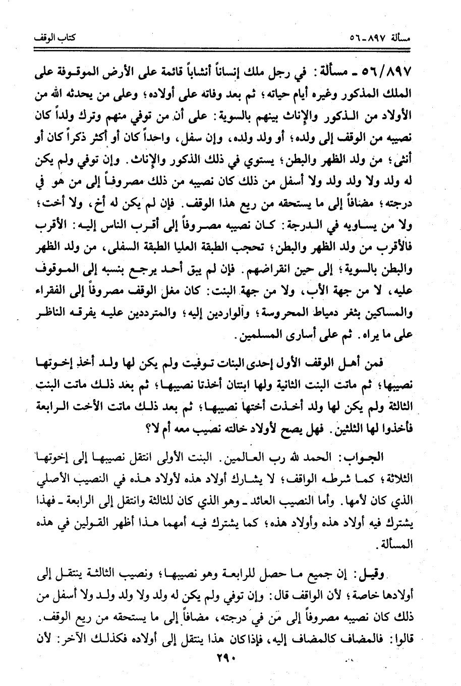 وَإِنْ تُوُفِّيَ وَلَمْ يَكُنْ لَهُ وَلَدٌ وَلَا وَلَدُ وَلَدٍ وَلَا أَسْفَلُ مِنْ ذَلِكَ كَانَ نَصِيبُهُ مِنْ ذَلِكَ مَصْرُوفًا إلَى مَنْ هُوَ فِي دَرَجَتِهِ؛ مُضَافًا إلَى مَا يَسْتَحِقُّهُ مِنْ رِيعِ هَذَا الْوَقْفِ. فَإِنْ لَمْ يَكُنْ لَهُ أَخٌ، وَلَا أُخْتٌ؛ وَلَا مِنْ يُسَاوِيه فِي الدَّرَجَةِ: كَانَ نَصِيبُهُ مَصْرُوفًا إلَى أَقْرَبِ النَّاسِ إلَيْهِ: الْأَقْرَبِ فَالْأَقْرَبِ مِنْ وَلَدِ الظَّهْرِ وَالْبَطْنِ؛ تَحْجُبُ الطَّبَقَةُ الْعُلْيَا الطَّبَقَةَ السُّفْلَى، مِنْ وَلَدِ الظَّهْرِ وَالْبَطْنِ بِالسَّوِيَّةِ؛ إلَى حِينِ انْقِرَاضِهِمْ. فَإِنْ لَمْ يَبْقَ أَحَدٌ يَرْجِعُ بِنَسَبِهِ إلَى الْمَوْقُوفِ عَلَيْهِ، لَا مِنْ جِهَةِ الْأَبِ، وَلَا مِنْ جِهَةِ الْبِنْتِ: كَانَ مُغَلُّ الْوَقْفِ مَصْرُوفًا إلَى الْفُقَرَاءِ وَالْمَسَاكِينِ بِثَغْرِ دِمْيَاطَ الْمَحْرُوسَةِ؛ وَالْوَارِدِينَ إلَيْهِ؛ وَالْمُتَرَدَّدِينَ عَلَيْهِ يُفَرِّقُهُ النَّاظِرُ عَلَى مَا يَرَاهُ. ثُمَّ عَلَى أَسَارَى الْمُسْلِمِينَ.