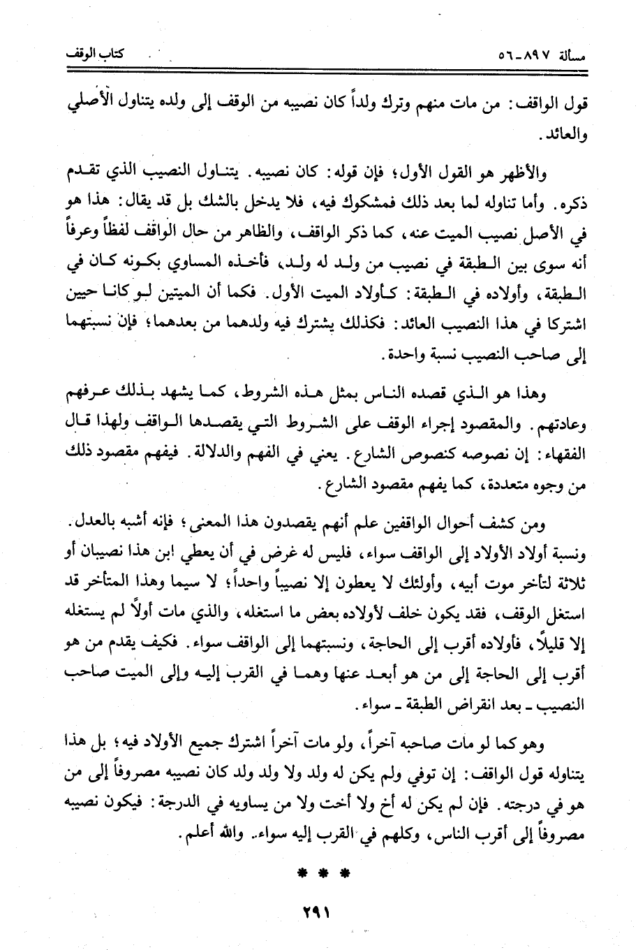 وَمَنْ كَشَفَ أَحْوَالَ الْوَاقِفِينَ عَلِمَ أَنَّهُمْ يَقْصِدُونَ هَذَا الْمَعْنَى؛ فَإِنَّهُ أَشْبَهُ بِالْعَدْلِ. وَنِسْبَةُ أَوْلَادِ الْأَوْلَادِ إلَى الْوَاقِفِ سَوَاءٌ، فَلَيْسَ لَهُ غَرَضٌ فِي أَنْ يُعْطِيَ ابْنَ هَذَا نَصِيبَيْنِ أَوْ ثَلَاثَةً لِتَأَخُّرِ مَوْتِ أَبِيهِ، وَأُولَئِكَ لَا يُعْطَوْنَ إلَّا نَصِيبًا وَاحِدًا؛ لَا سِيَّمَا وَهَذَا الْمُتَأَخِّرُ قَدْ اسْتَغَلَّ الْوَقْفَ، فَقَدْ يَكُونُ خَلَّفَ لِأَوْلَادِهِ بَعْضَ مَا اسْتَغَلَّهُ، وَاَلَّذِي مَاتَ أَوَّلًا لَمْ يَسْتَغِلَّهُ إلَّا قَلِيلًا، فَأَوْلَادُهُ أَقْرَبُ إلَى الْحَاجَةِ، وَنِسْبَتُهُمَا إلَى الْوَاقِفِ سَوَاءٌ. فَكَيْفَ يُقَدَّمُ مَنْ هُوَ أَقْرَبُ إلَى الْحَاجَةِ إلَى مَنْ هُوَ أَبْعَدُ عَنْهَا وَهُمَا فِي الْقُرْبِ إلَيْهِ وَإِلَى الْمَيِّتِ صَاحِبِ النَّصِيبِ - بَعْدَ انْقِرَاضِ الطَّبَقَةِ - سَوَاءٌ.