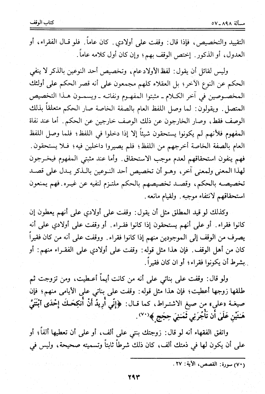 التَّقْيِيدِ وَالتَّخْصِيصِ، فَإِذَا قَالَ: وَقَفْت عَلَى أَوْلَادِي. كَانَ عَامًّا. فَلَوْ قَالَ الْفُقَرَاءُ، أَوْ الْعُدُولِ، أَوْ الذُّكُورِ. اخْتَصَّ الْوَقْفُ بِهِمْ؛ وَإِنْ كَانَ أَوَّلُ كَلَامِهِ عَامًّا.