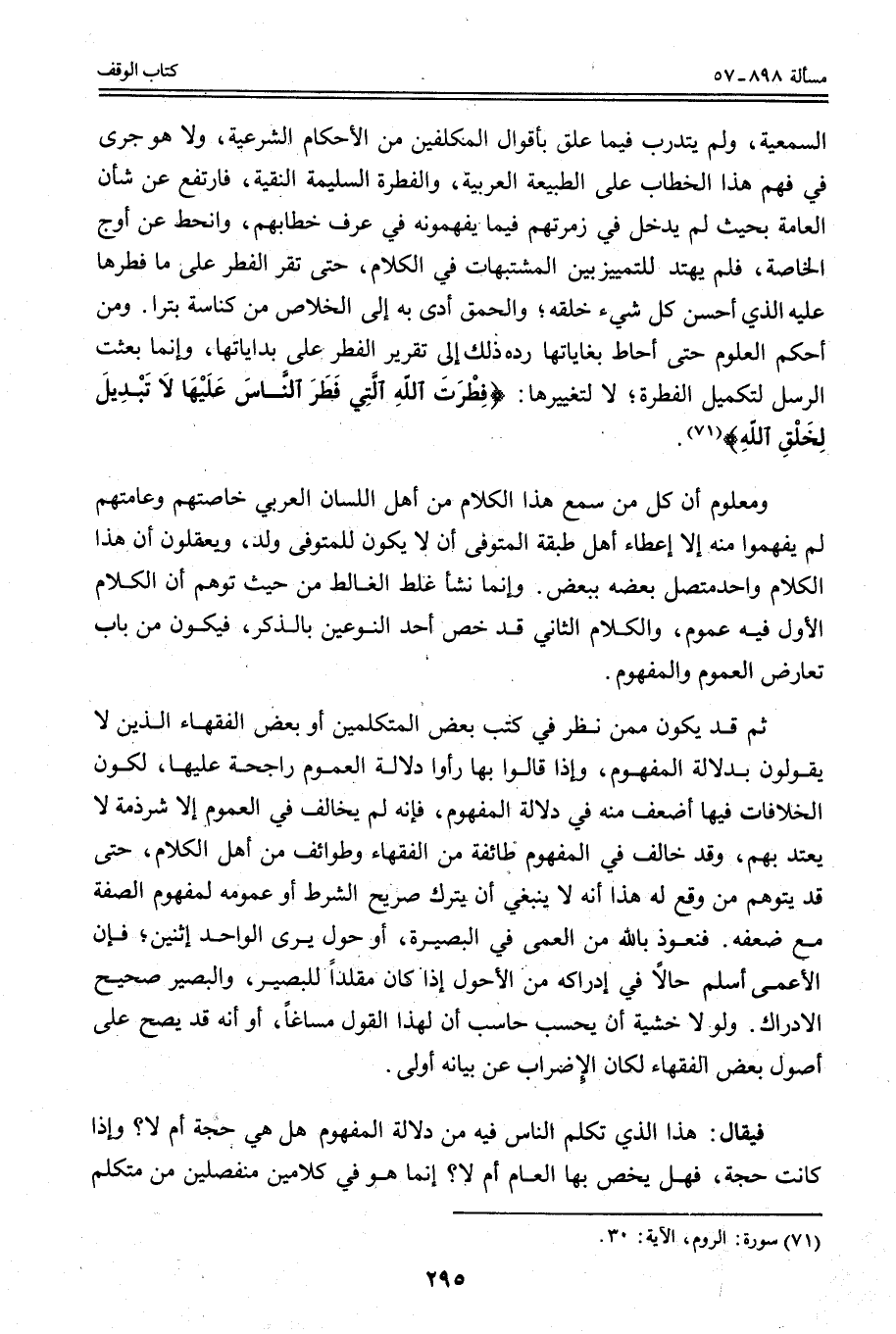 ثُمَّ قَدْ يَكُونُ مِمَّنْ نَظَرَ فِي كُتُبِ بَعْضِ الْمُتَكَلِّمِينَ أَوْ بَعْضِ الْفُقَهَاءِ الَّذِينَ لَا يَقُولُونَ بِدَلَالَةِ الْمَفْهُومِ، وَإِذَا قَالُوا بِهَا رَأَوْا دَلَالَةَ الْعُمُومِ رَاجِحَةً عَلَيْهَا، لِكَوْنِ الْخِلَافَاتِ فِيهَا أَضْعَفَ مِنْهُ فِي دَلَالَةِ الْمَفْهُومِ، فَإِنَّهُ لَمْ يُخَالِفْ فِي الْعُمُومِ إلَّا شِرْذِمَةٌ لَا يُعْتَدُّ بِهِمْ، وَقَدْ خَالَفَ فِي الْمَفْهُومِ طَائِفَةٌ مِنْ الْفُقَهَاءِ وَطَوَائِفُ مِنْ أَهْلِ الْكَلَامِ، حَتَّى قَدْ يُتَوَهَّمُ مَنْ وَقَعَ لَهُ هَذَا أَنَّهُ لَا يَنْبَغِي أَنْ يَتْرُكَ صَرِيحَ الشَّرْطِ أَوْ عُمُومَهُ لِمَفْهُومِ الصِّفَةِ مَعَ ضَعْفِهِ. فَنَعُوذُ بِاَللَّهِ مِنْ الْعَمَى فِي الْبَصِيرَةِ، أَوْ حَوَلٍ يُرِي الْوَاحِدَ اثْنَيْنِ؛ فَإِنَّ الْأَعْمَى أَسْلَمُ حَالًا فِي إدْرَاكِهِ مِنْ الْأَحْوَلِ إذَا كَانَ مُقَلِّدًا لِلْبَصِيرِ، وَالْبَصِيرُ صَحِيحُ الْإِدْرَاكِ. وَلَوْلَا خَشْيَةُ أَنْ يَحْسِبَ حَاسِبٌ أَنَّ لِهَذَا الْقَوْلِ مَسَاغًا، أَوْ أَنَّهُ قَدْ يَصِحُّ عَلَى أُصُولِ بَعْضِ الْفُقَهَاءِ لَكَانَ الْإِضْرَابُ عَنْ بَيَانِهِ أَوْلَى.