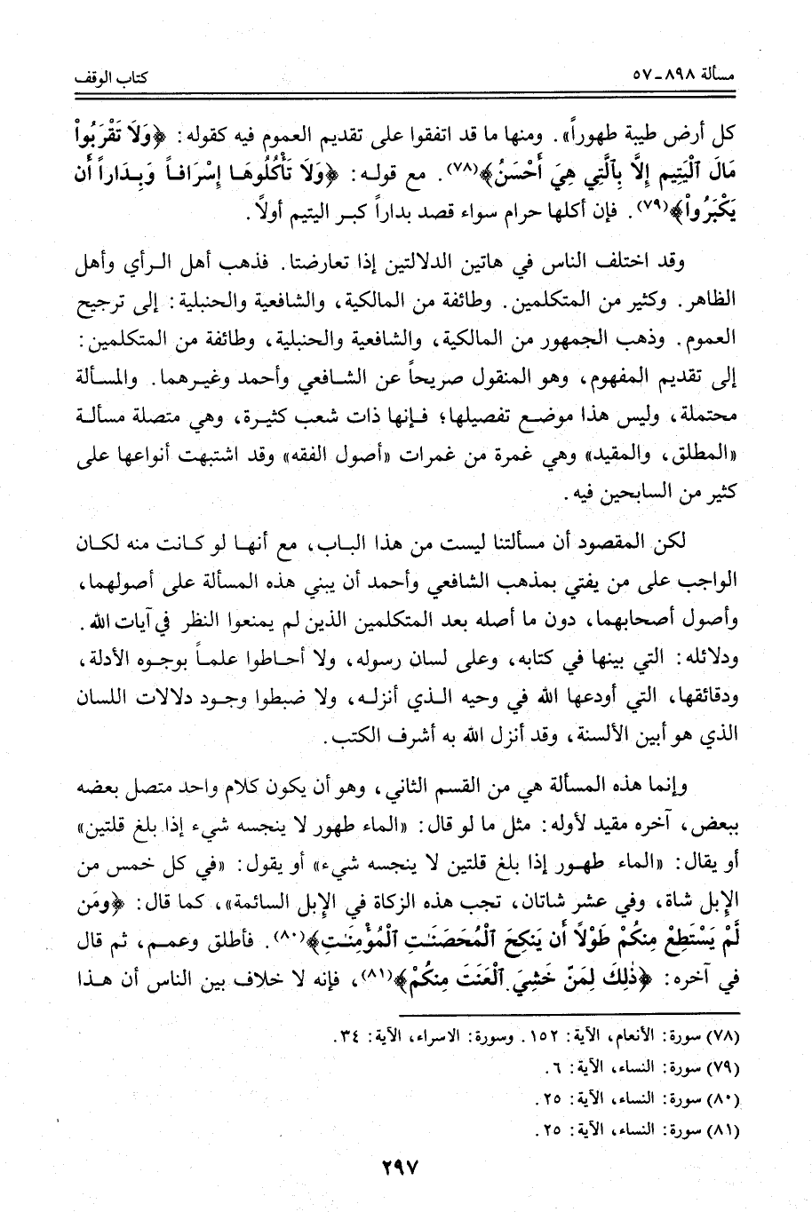 لَكِنَّ الْمَقْصُودَ أَنَّ مَسْأَلَتَنَا لَيْسَتْ مِنْ هَذَا الْبَابِ، مَعَ أَنَّهَا لَوْ كَانَتْ مِنْهُ لَكَانَ الْوَاجِب عَلَى مَنْ يُفْتِي بِمَذْهَبِ الشَّافِعِيِّ وَأَحْمَدَ أَنْ يَبْنِيَ هَذِهِ الْمَسْأَلَةَ عَلَى أُصُولِهِمَا، وَأُصُولِ أَصْحَابِهِمَا، دُونَ مَا أَصْلُهُ بَعْدَ الْمُتَكَلِّمِينَ الَّذِينَ لَمْ يُمْنَعُوا النَّظَرَ فِي آيَاتِ اللَّهِ. وَدَلَائِلِهِ: الَّتِي بَيَّنَهَا فِي كِتَابِهِ، وَعَلَى لِسَانِ رَسُولِهِ، وَلَا أَحَاطُوا عِلْمًا بِوُجُوهِ الْأَدِلَّةِ، وَدَقَائِقِهَا، الَّتِي أَوْدَعَهَا اللَّهُ فِي وَحْيِهِ الَّذِي أَنْزَلَهُ، وَلَا ضَبَطُوا وُجُودَ دَلَالَاتِ اللِّسَانِ الَّذِي هُوَ أَبْيَنُ الْأَلْسِنَةِ، وَقَدْ أَنْزَلَ اللَّهُ بِهِ أَشْرَفَ الْكُتُبِ.