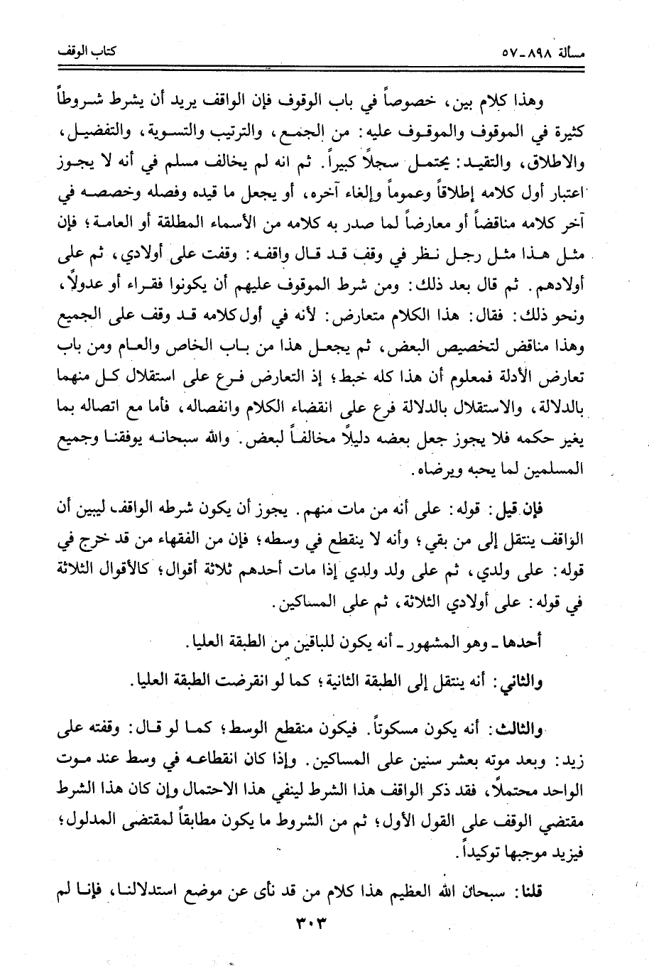 وَهَذَا كَلَامٌ بَيِّنٌ، خُصُوصًا فِي بَابِ الْوُقُوفِ فَإِنَّ الْوَاقِفَ يُرِيدُ أَنْ يَشْرِطَ شُرُوطًا كَثِيرَةً فِي الْمَوْقُوفِ وَالْمَوْقُوفُ عَلَيْهِ: مِنْ الْجَمْعِ، وَالتَّرْتِيبِ وَالتَّسْوِيَةِ، وَالتَّفْصِيلِ، وَالْإِطْلَاقِ، وَالتَّقَيُّدِ: يَحْتَمِلُ سِجِلًّا كَبِيرًا. ثُمَّ إنَّهُ لَمْ يُخَالِفْ مُسْلِمٌ فِي أَنَّهُ لَا يَجُوزُ اعْتِبَارُ أَوَّلِ كَلَامِهِ إطْلَاقًا وَعُمُومًا وَإِلْغَاءُ آخِرِهِ، أَوْ يُجْعَلُ مَا قَيَّدَهُ وَفَصَّلَهُ وَخَصَّصَهُ فِي آخِرِ كَلَامِهِ مُنَاقِضًا أَوْ مُعَارِضًا لِمَا صَدَّرَ بِهِ كَلَامَهُ مِنْ الْأَسْمَاءِ الْمُطْلَقَةِ أَوْ الْعَامَّةِ؛ فَإِنَّ مِثْلَ هَذَا مِثْلُ رَجُلٍ نَظَرَ فِي وَقْفٍ قَدْ قَالَ وَاقِفُهُ: وَقَفْت عَلَى أَوْلَادِي، ثُمَّ عَلَى أَوْلَادِهِمْ. ثُمَّ قَالَ بَعْدَ ذَلِكَ: وَمِنْ شَرْطِ الْمَوْقُوفِ عَلَيْهِمْ أَنْ يَكُونُوا فُقَرَاءَ أَوْ عُدُولًا، وَنَحْوَ ذَلِكَ: فَقَالَ: هَذَا الْكَلَامُ مُتَعَارِضٌ: لِأَنَّهُ فِي أَوَّلِ كَلَامِهِ قَدْ وَقَفَ عَلَى الْجَمِيعِ وَهَذَا مُنَاقِضٌ لِتَخْصِيصِ الْبَعْضِ، ثُمَّ يَجْعَلُ هَذَا مِنْ بَابِ الْخَاصِّ وَالْعَامِّ وَمِنْ بَابِ تَعَارُضِ الْأَدِلَّةِ فَمَعْلُومٌ أَنَّ هَذَا كُلَّهُ خَبْطٌ؛ إذْ التَّعَارُضُ فَرْعٌ عَلَى اسْتِقْلَالِ كُلٍّ مِنْهُمَا بِالدَّلَالَةِ، وَالِاسْتِقْلَالُ بِالدَّلَالَةِ فَرْعٌ عَلَى انْقِضَاءِ الْكَلَامِ وَانْفِصَالِهِ، فَأَمَّا مَعَ اتِّصَالِهِ بِمَا يُغَيِّرُ حُكْمَهُ فَلَا يَجُوزُ جَعْلُ بَعْضِهِ دَلِيلًا مُخَالِفًا لِبَعْضٍ. وَاَللَّهُ سُبْحَانَهُ يُوَفِّقُنَا وَجَمِيعَ الْمُسْلِمِينَ لِمَا يُحِبُّهُ وَيَرْضَاهُ.