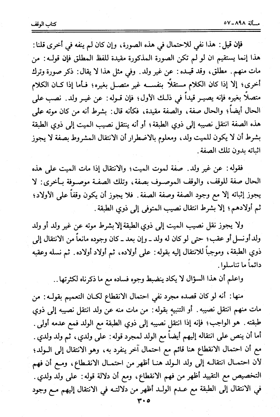 مِنْهَا: أَنَّهُ لَوْ كَانَ قَصْدُهُ مُجَرَّدَ نَفْيِ احْتِمَالِ الِانْقِطَاعِ لَكَانَ التَّعْمِيمُ بِقَوْلِهِ: مَنْ مَاتَ مِنْهُمْ انْتَقَلَ نَصِيبُهُ. أَوْ التَّنْبِيهُ بِقَوْلِهِ: مَنْ مَاتَ مِنْهُ عَنْ وَلَدٍ انْتَقَلَ نَصِيبُهُ إلَى ذَوِي طَبَقَتِهِ. هُوَ الْوَاجِبُ؛ فَإِنَّهُ إذَا انْتَقَلَ نَصِيبُهُ إلَى ذَوِي الطَّبَقَةِ مَعَ الْوَلَدِ فَمَعَ عَدَمِهِ أَوْلَى. أَمَّا أَنْ يَنُصَّ عَلَى انْتِقَالِهِ إلَيْهِمْ أَيْضًا مَعَ الْوَلَدِ لِمُجَرَّدِ قَوْلِهِ: عَلَى وَلَدِي، ثُمَّ وَلَدِ وَلَدِي؛ مَعَ أَنَّ احْتِمَالَ الِانْقِطَاعِ هُنَا قَائِمٌ مَعَ احْتِمَالٍ آخَرَ يَنْفَرِدُ بِهِ، وَهُوَ الِانْتِقَالُ إلَى الْوَلَدِ؛ لِأَنَّ احْتِمَالَ انْتِقَالِهِ إلَى وَلَدِ الْوَلَدِ هُنَا أَظْهَرُ مِنْ احْتِمَالِ الِانْقِطَاعِ، وَمَعَ أَنَّ فَهْمَ التَّخْصِيصِ مَعَ التَّقْيِيدِ أَظْهَرُ مِنْ فَهْمِ الِانْقِطَاعِ، وَمَعَ أَنَّ دَلَالَةَ قَوْلِهِ: عَلَى وَلَدِ وَلَدِي. فِي الِانْتِقَالِ إلَى الطَّبَقَةِ مَعَ عَدَمِ الْوَلَدِ أَظْهَرُ مِنْ دَلَالَتِهِ فِي الِانْتِقَالِ إلَيْهِمْ مَعَ وُجُودِ