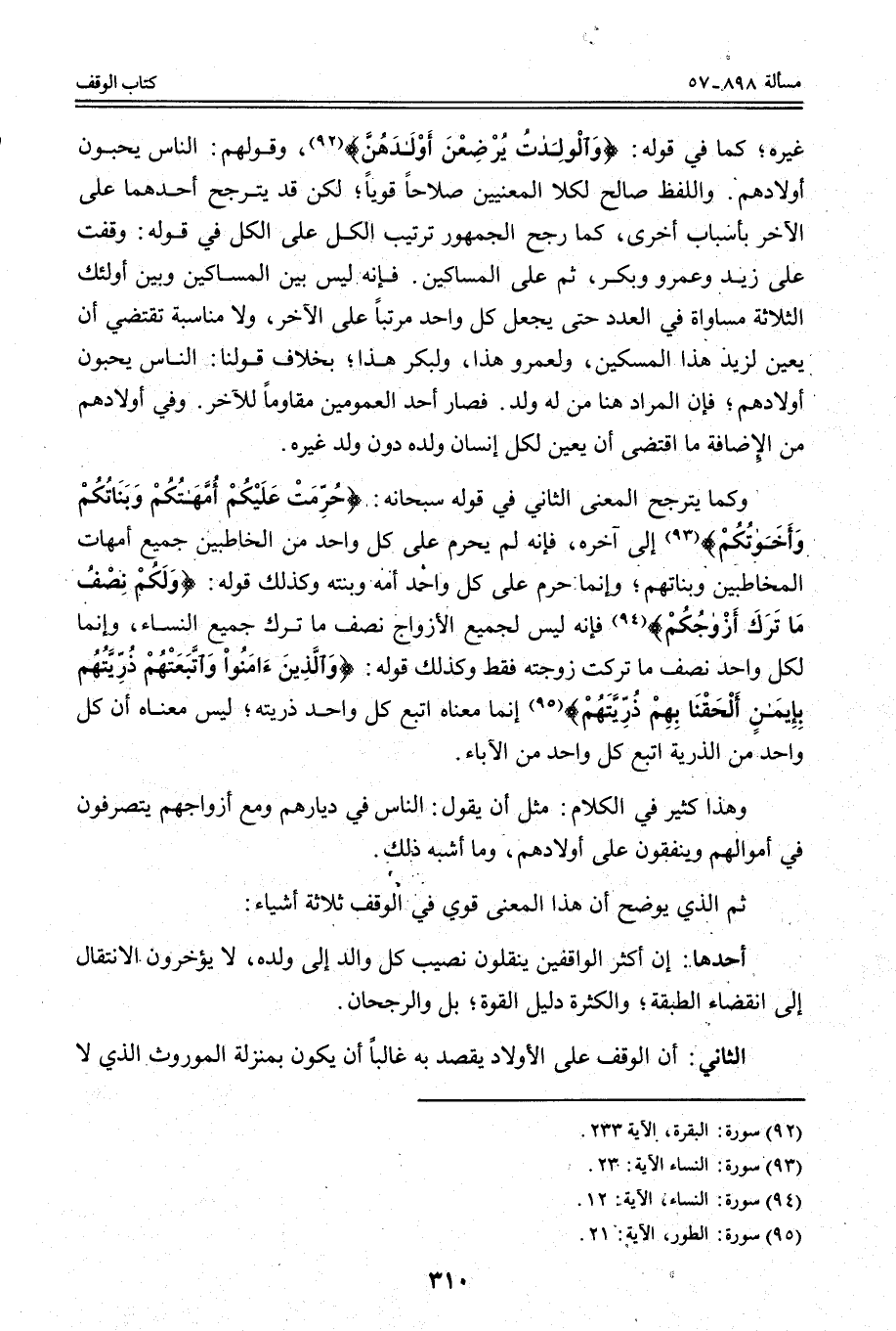 وَهَذَا كَثِيرٌ فِي الْكَلَامِ: مِثْلَ أَنْ يَقُولَ: النَّاسُ فِي دِيَارِهِمْ وَمَعَ أَزْوَاجِهِمْ يَتَصَرَّفُونَ فِي أَمْوَالِهِمْ وَيُنْفِقُونَ عَلَى أَوْلَادِهِمْ، وَمَا أَشْبَهَ ذَلِكَ. ثُمَّ الَّذِي يُوَضِّحُ أَنَّ هَذَا الْمَعْنَى قَوِيٌّ فِي الْوَقْفِ ثَلَاثَةُ أَشْيَاءَ: أَحَدُهَا: أَنَّ أَكْثَرَ الْوَاقِفِينَ يَنْقُلُونَ نَصِيبَ كُلِّ وَالِدٍ إلَى وَلَدِهِ، لَا يُؤَخِّرُونَ الِانْتِقَالَ إلَى انْقِضَاءِ الطَّبَقَةِ؛ وَالْكَثْرَةُ دَلِيلُ الْقُوَّةِ؛ بَلْ وَالرُّجْحَانِ.
