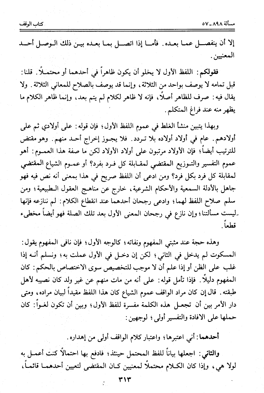 وَبِهَذَا يَتَبَيَّنُ مَنْشَأُ الْغَلَطِ فِي عُمُومِ اللَّفْظِ الْأَوَّلِ؛ فَإِنَّ قَوْلَهُ: عَلَى أَوْلَادِي ثُمَّ عَلَى أَوْلَادِهِمْ. عَامٌّ فِي أَوْلَادِ أَوْلَادِهِ بِلَا تَرَدُّدٍ. فَلَا يَجُوزُ إخْرَاجُ أَحَدٍ مِنْهُمْ. وَهُوَ مُقْتَضٍ لِلتَّرْتِيبِ أَيْضًا؛ فَإِنَّ الْأَوْلَادَ مُرَتَّبُونَ عَلَى أَوْلَادِ الْأَوْلَادِ لَكِنَّ صِفَةَ هَذَا الْعُمُومِ: أَهُوَ عُمُومُ التَّفْسِيرِ وَالتَّوْزِيعِ الْمُقْتَضِي لِمُقَابَلَةِ كُلِّ فَرْدٍ بِفَرْدٍ؟ أَوْ عُمُومِ الشِّيَاعِ الْمُقْتَضِي لِمُقَابَلَةِ كُلِّ فَرْدٍ بِكُلِّ فَرْدٍ؟ وَمَنْ ادَّعَى أَنَّ اللَّفْظَ صَرِيحٌ فِي هَذَا بِمَعْنَى أَنَّهُ نَصٌّ فِيهِ فَهُوَ جَاهِلٌ بِالْأَدِلَّةِ السَّمْعِيَّةِ وَالْأَحْكَامِ الشَّرْعِيَّةِ، خَارِجٌ عَنْ مَنَاهِجِ الْعُقُولِ الطَّبِيعِيَّةِ؛ وَمَنْ سَلَّمَ صَلَاحَ اللَّفْظِ لَهُمَا؛ وَادَّعَى رُجْحَانَ أَحَدِهِمَا عِنْدَ انْقِطَاعِ الْكَلَامِ: لَمْ نُنَازِعْهُ فَإِنَّهَا لَيْسَتْ مَسْأَلَتَنَا؛ وَإِنْ نَازَعَ فِي رُجْحَانِ الْمَعْنَى الْأَوَّلِ بَعْدَ تِلْكَ الصِّلَةِ فَهُوَ أَيْضًا مُخْطِئٌ قَطْعًا.