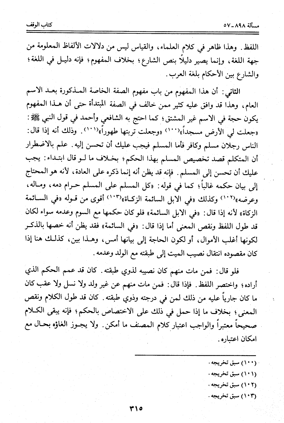 «جُعِلَتْ لِي الْأَرْضُ مَسْجِدًا وَجُعِلَتْ تُرْبَتُهَا طَهُورًا» . وَذَلِكَ أَنَّهُ إذَا قَالَ: النَّاسُ رَجُلَانِ مُسْلِمٌ وَكَافِرٌ فَأَمَّا الْمُسْلِمُ فَيَجِبُ عَلَيْك أَنْ تُحْسِنَ إلَيْهِ. عُلِمَ بِالِاضْطِرَارِ أَنَّ الْمُتَكَلِّمَ قَصَدَ تَخْصِيصَ الْمُسْلِمِ بِهَذَا الْحُكْمِ؛ بِخِلَافِ مَا لَوْ قَالَ ابْتِدَاءً: يَجِبُ عَلَيْك أَنْ تُحْسِنَ إلَى الْمُسْلِمِ. فَإِنَّهُ قَدْ يُظَنُّ أَنَّهُ إنَّمَا ذَكَرَهُ عَلَى الْعَادَةِ؛ لِأَنَّهُ هُوَ الْمُحْتَاجُ إلَى بَيَانِ حُكْمِهِ غَالِبًا؛ كَمَا فِي قَوْلِهِ: «كُلُّ الْمُسْلِمِ عَلَى الْمُسْلِمِ حَرَامٌ دَمُهُ، وَمَالُهُ، وَعِرْضُهُ» وَكَذَلِكَ «فِي الْإِبِلِ السَّائِمَةِ الزَّكَاةُ» أَقْوَى مِنْ قَوْلِهِ «فِي السَّائِمَةِ الزَّكَاةُ» ؛ لِأَنَّهُ إذَا قَالَ: «فِي الْإِبِلِ السَّائِمَةِ» فَلَوْ كَانَ حُكْمُهَا مَعَ السَّوْمِ وَعَدَمِهِ سَوَاءً لَكَانَ قَدْ طَوَّلَ اللَّفْظَ وَنَقَصَ الْمَعْنَى أَمَّا إذَا قَالَ: " فِي السَّائِمَةِ " فَقَدْ يُظَنُّ أَنَّهُ خَصَّهَا بِالذِّكْرِ لِكَوْنِهَا أُغْلَبَ الْأَمْوَالِ، أَوْ لِكَوْنِ الْحَاجَةِ إلَى بَيَانِهَا أَمَسَّ، وَهَذَا بَيِّنٌ، كَذَلِكَ هُنَا إذَا كَانَ مَقْصُودُهُ انْتِقَالَ نَصِيبِ الْمَيِّتِ إلَى طَبَقَتِهِ مَعَ الْوَلَدِ وَعَدَمِهِ.