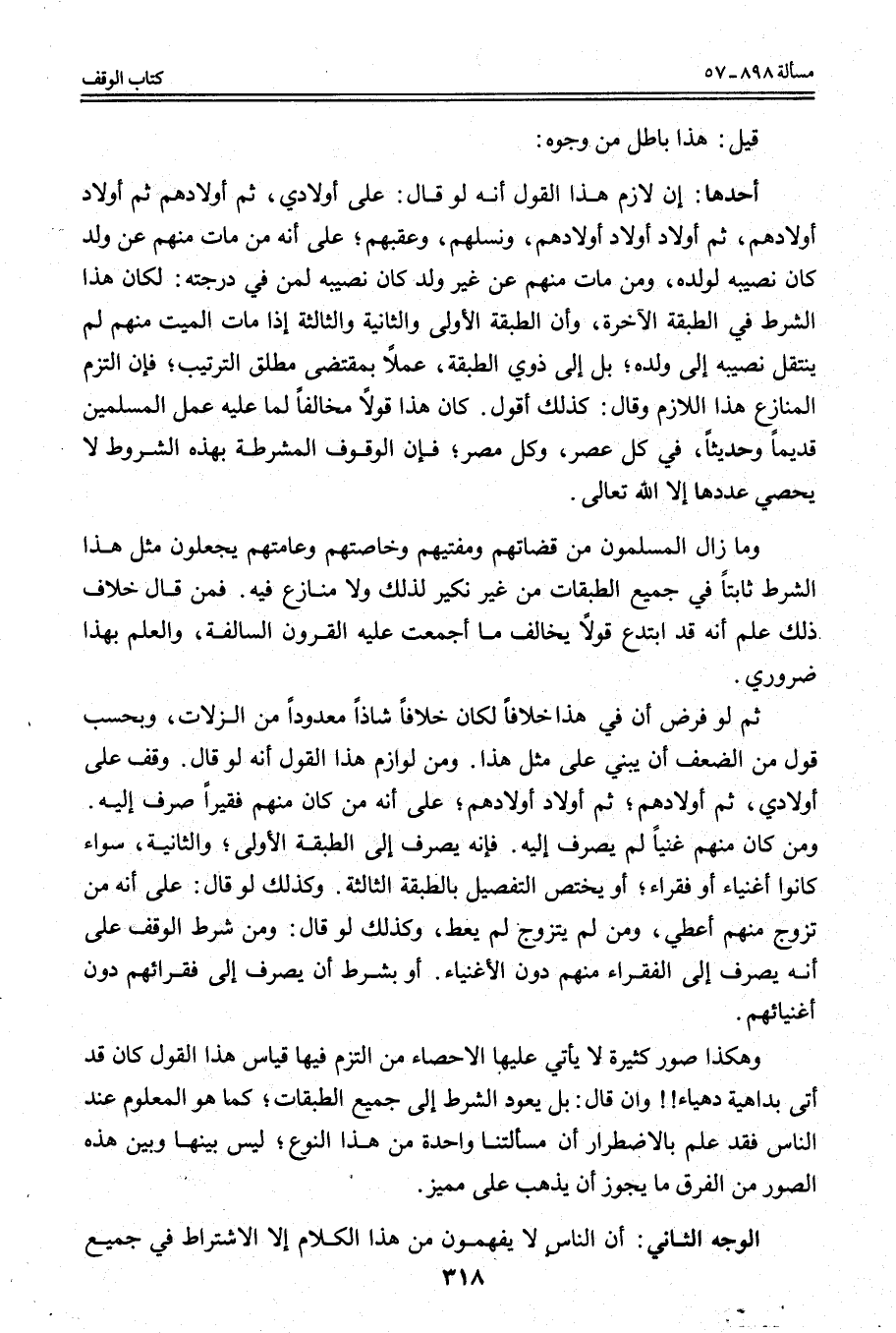 ثُمَّ لَوْ فُرِضَ أَنَّ فِي هَذَا خِلَافًا لَكَانَ خِلَافًا شَاذًّا مَعْدُودًا مِنْ الزَّلَّاتِ، وَبِحَسْبِ قَوْلٍ مِنْ الضَّعْفِ أَنْ يُبْنَى عَلَى مِثْلِ هَذَا. وَمِنْ لَوَازِمِ هَذَا الْقَوْلِ أَنَّهُ لَوْ قَالَ. وَقْفٌ عَلَى أَوْلَادِي، ثُمَّ أَوْلَادِهِمْ؛ ثُمَّ أَوْلَادِ أَوْلَادِهِمْ؛ عَلَى أَنَّهُ مَنْ كَانَ مِنْهُمْ فَقِيرًا صُرِفَ إلَيْهِ. وَمَنْ كَانَ مِنْهُمْ غَنِيًّا لَمْ يُصْرَفْ إلَيْهِ. فَإِنَّهُ يُصْرَفُ إلَى الطَّبَقَةِ الْأُولَى؛ وَالثَّانِيَةِ، سَوَاءٌ كَانُوا أَغْنِيَاءَ أَوْ فُقَرَاءَ؛ أَوْ يَخْتَصُّ التَّفْصِيلُ بِالطَّبَقَةِ الثَّالِثَةِ. وَكَذَلِكَ لَوْ قَالَ: عَلَى أَنَّهُ مَنْ تَزَوَّجَ مِنْهُمْ أُعْطِيَ، وَمَنْ لَمْ يَتَزَوَّجْ لَمْ يُعْطَ، وَكَذَلِكَ لَوْ قَالَ: وَمِنْ شَرْطِ الْوَقْفِ عَلَى أَنَّهُ يُصْرَفُ إلَى الْفُقَرَاءِ مِنْهُمْ دُونَ الْأَغْنِيَاءِ. أَوْ بِشَرْطِ أَنْ يُصْرَفَ إلَى فُقَرَائِهِمْ دُونَ أَغْنِيَائِهِمْ.