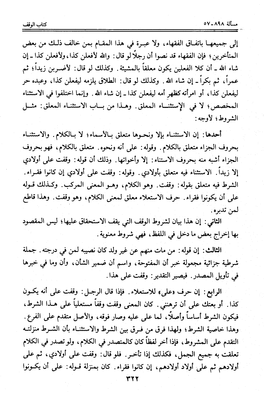 وَقَوْلُهُ: عَلَى أَنَّهُ وَنَحْوَهُ. مُتَعَلِّقٌ بِالْكَلَامِ، فَهُوَ بِحُرُوفِ الْجَزَاءِ أَشْبَهُ مِنْهُ بِحُرُوفِ الِاسْتِثْنَاءِ: إلَّا وَأَخَوَاتِهَا. وَذَلِكَ أَنَّ قَوْلَهُ: وَقَفْت عَلَى أَوْلَادِي إلَّا زَيْدًا. الِاسْتِثْنَاءُ فِيهِ مُتَعَلِّقٌ بِأَوْلَادِي. وَقَوْلُهُ: وَقَفْت عَلَى أَوْلَادِي إنْ كَانُوا فُقَرَاءَ. الشَّرْطُ فِيهِ مُتَعَلِّقٌ بِقَوْلِهِ: وَقَفْت. وَهُوَ الْكَلَامُ، وَهُوَ الْمَعْنَى الْمُرَكَّبُ. وَكَذَلِكَ قَوْلُهُ عَلَى أَنْ يَكُونُوا فُقَرَاءَ. حَرْفُ الِاسْتِعْلَاءِ مُعَلِّقٌ لِمَعْنَى الْكَلَامِ، وَهُوَ وَقَفْت. وَهَذَا قَاطِعٌ لِمَنْ تَدَبَّرْهُ.