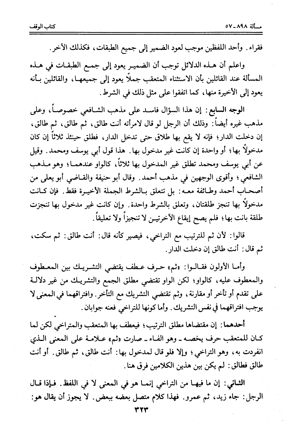 الْوَجْهُ السَّابِعُ: أَنَّ هَذَا السُّؤَالَ فَاسِدٌ عَلَى مَذْهَبِ الشَّافِعِيِّ خُصُوصًا، وَعَلَى مَذْهَبِ غَيْرِهِ أَيْضًا: وَذَلِكَ أَنَّ الرَّجُلَ لَوْ قَالَ لِامْرَأَتِهِ أَنْت طَالِقٌ، ثُمَّ طَالِقٌ، ثُمَّ طَالِقٌ، إنْ دَخَلْت الدَّارَ؛ فَإِنَّهُ لَا يَقَعُ بِهَا طَلَاقٌ حَتَّى تَدْخُلَ الدَّارَ، فَطَلَّقَ حِينَئِذٍ ثَلَاثًا إنْ كَانَ مَدْخُولًا بِهَا؛ أَوْ وَاحِدَةً إنْ كَانَتْ غَيْرَ مَدْخُولٍ بِهَا. هَذَا قَوْلُ أَبِي يُوسُفَ وَمُحَمَّدٍ. وَقِيلَ عَنْ أَبِي يُوسُفَ وَمُحَمَّدٍ تَطْلُقُ غَيْرُ الْمَدْخُولِ بِهَا ثَلَاثًا، كَالْوَاوِ عِنْدَهُمَا؛ وَهُوَ مَذْهَبُ الشَّافِعِيِّ؛ وَأَقْوَى الْوَجْهَيْنِ فِي هَذِهِ أَحْمَدُ. وَقَالَ أَبُو حَنِيفَةَ وَالْقَاضِي أَبُو يَعْلَى مِنْ أَصْحَابِ أَحْمَدَ وَطَائِفَةٍ مَعَهُ: بَلْ تَتَعَلَّقُ بِالشَّرْطِ الْجُمْلَةُ الْأَخِيرَةُ فَقَطْ. فَإِنْ كَانَتْ مَدْخُولًا بِهَا تَنَجَّزُ طَلْقَتَانِ، وَتُعَلَّقُ بِالشَّرْطِ وَاحِدَةٌ. وَإِنْ كَانَتْ غَيْرَ مَدْخُولٍ بِهَا تَنَجَّزَتْ طَلْقَةٌ بَانَتْ بِهَا؛ فَلَمْ يَصِحَّ إيقَاعُ الْآخِرَتَيْنِ لَا تَنْجِيزًا وَلَا تَعْلِيقًا.