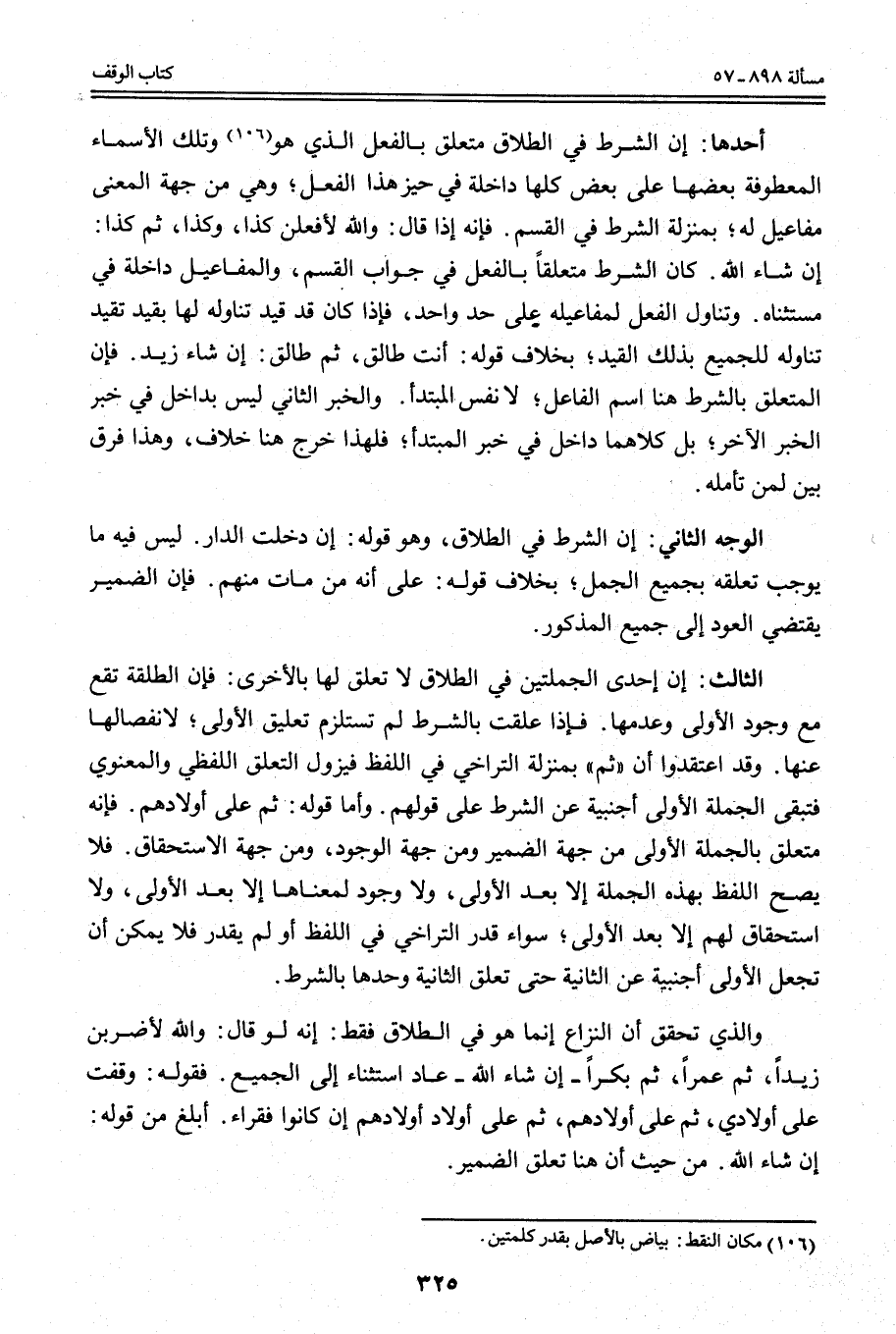 أَحَدُهَا: أَنَّ الشَّرْطَ فِي الطَّلَاقِ مُتَعَلِّقٌ بِالْفِعْلِ الَّذِي هُوَ وَتِلْكَ الْأَسْمَاءُ الْمَعْطُوفَةُ بَعْضُهَا عَلَى بَعْضٍ كُلُّهَا دَاخِلَةٌ فِي حَيِّزِ هَذَا الْفِعْلِ. وَهِيَ مِنْ جِهَةِ الْمَعْنَى مَفَاعِيلُ لَهُ؛ بِمَنْزِلَةِ الشَّرْطِ فِي الْقَسَمِ. فَإِنَّهُ إذَا قَالَ: وَاَللَّهِ لَأَفْعَلَنَّ كَذَا، وَكَذَا، ثُمَّ كَذَا: إنْ شَاءَ اللَّهُ. كَانَ الشَّرْطُ مُتَعَلِّقًا بِالْفِعْلِ فِي جَوَابِ الْقَسَمِ، وَالْمَفَاعِيلُ دَاخِلَةٌ فِي مُسْتَثْنَاهُ.